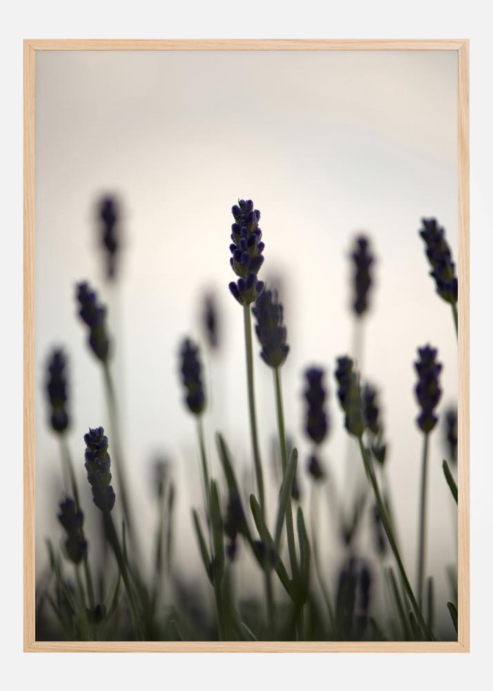 Une affiche florale d'un gros plan de fleurs de lavande dans un champ. Regardez attentivement et vous pourrez voir les bourgeons violets se balancer au sommet des tiges vertes. Ils se dressent sur un fond blanc simple, la touche parfaite pour une pièce colorée.