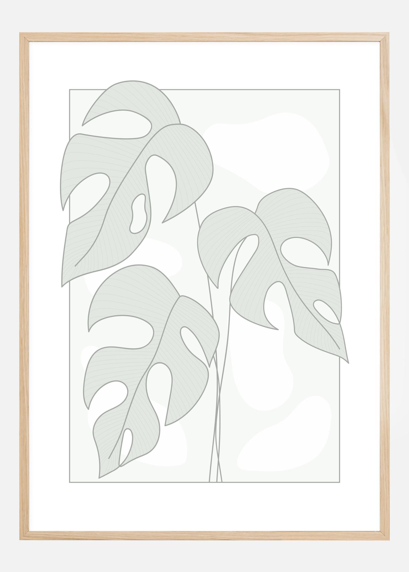 Une affiche de feuilles de monstera illustratives. Trois grandes feuilles remplissent l'image, chacune dans un ton gris doux. Des lignes très fines forment les tiges, tandis que ces feuilles élégantes et trouées pendent dans l'image. Restez discret en l'accrochant sur un mur vert tendre pour donner une impression de nature.