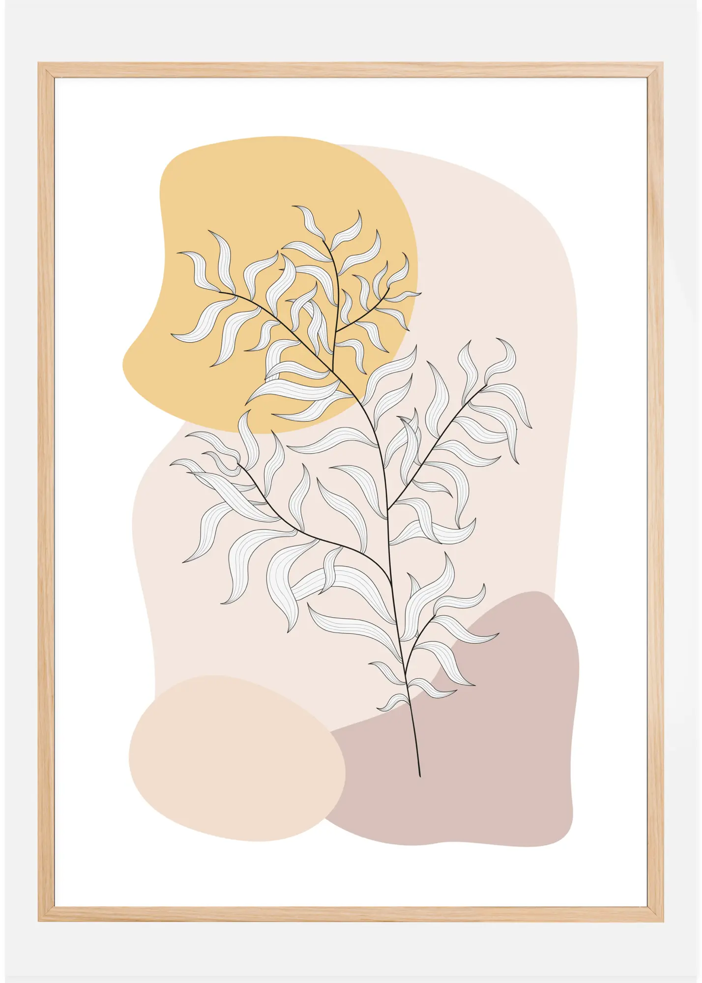 Une affiche de style imprimé d'une fine branche de feuilles vertes. La branche stylisée et les feuilles de couleur vert menthe reposent sur une série de formes étranges, chacune d'une couleur différente. En bas, des rochers gris et bruns. Vers le haut, une forme orange vif représente le soleil qui brille sur cette petite plante.