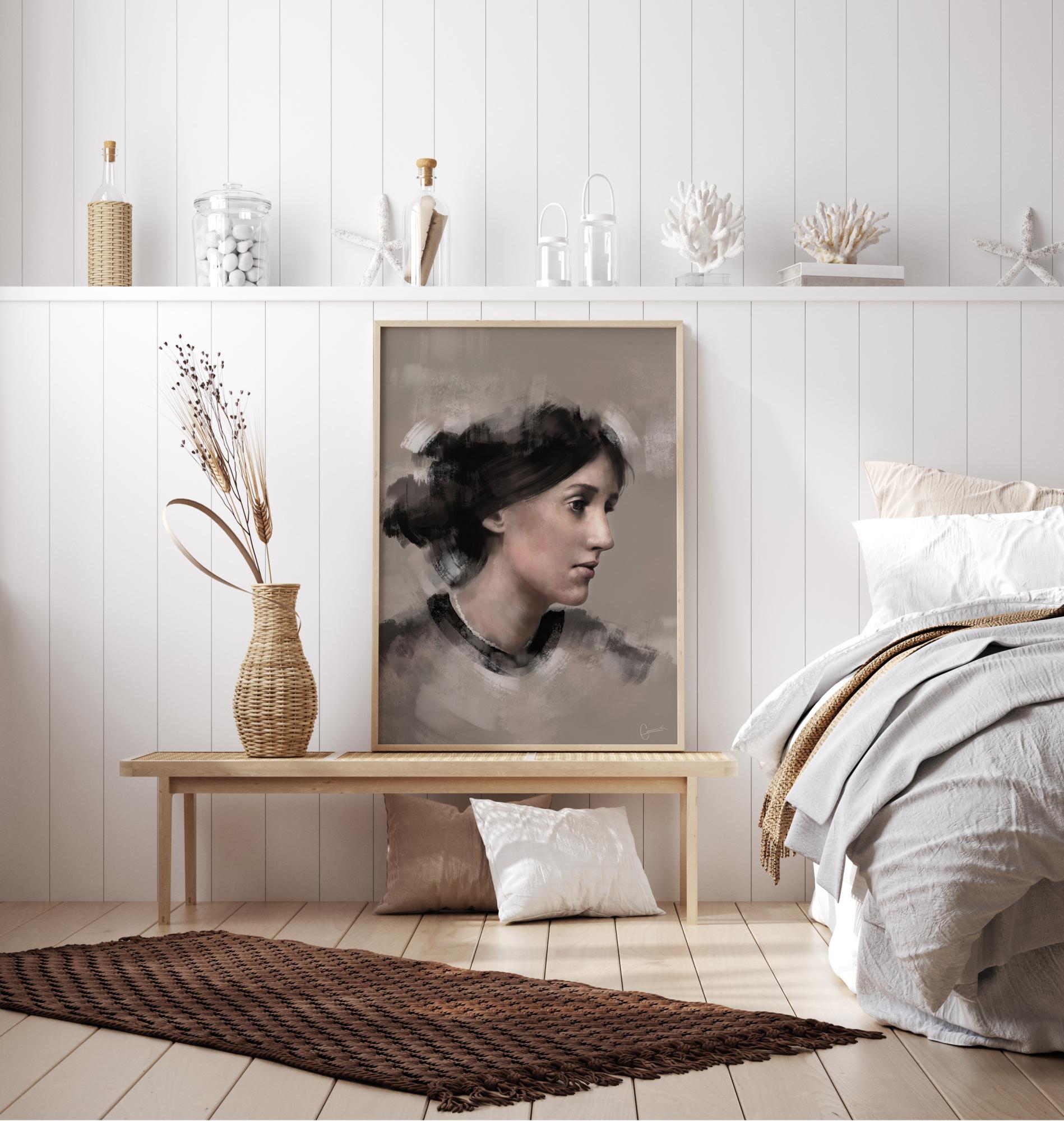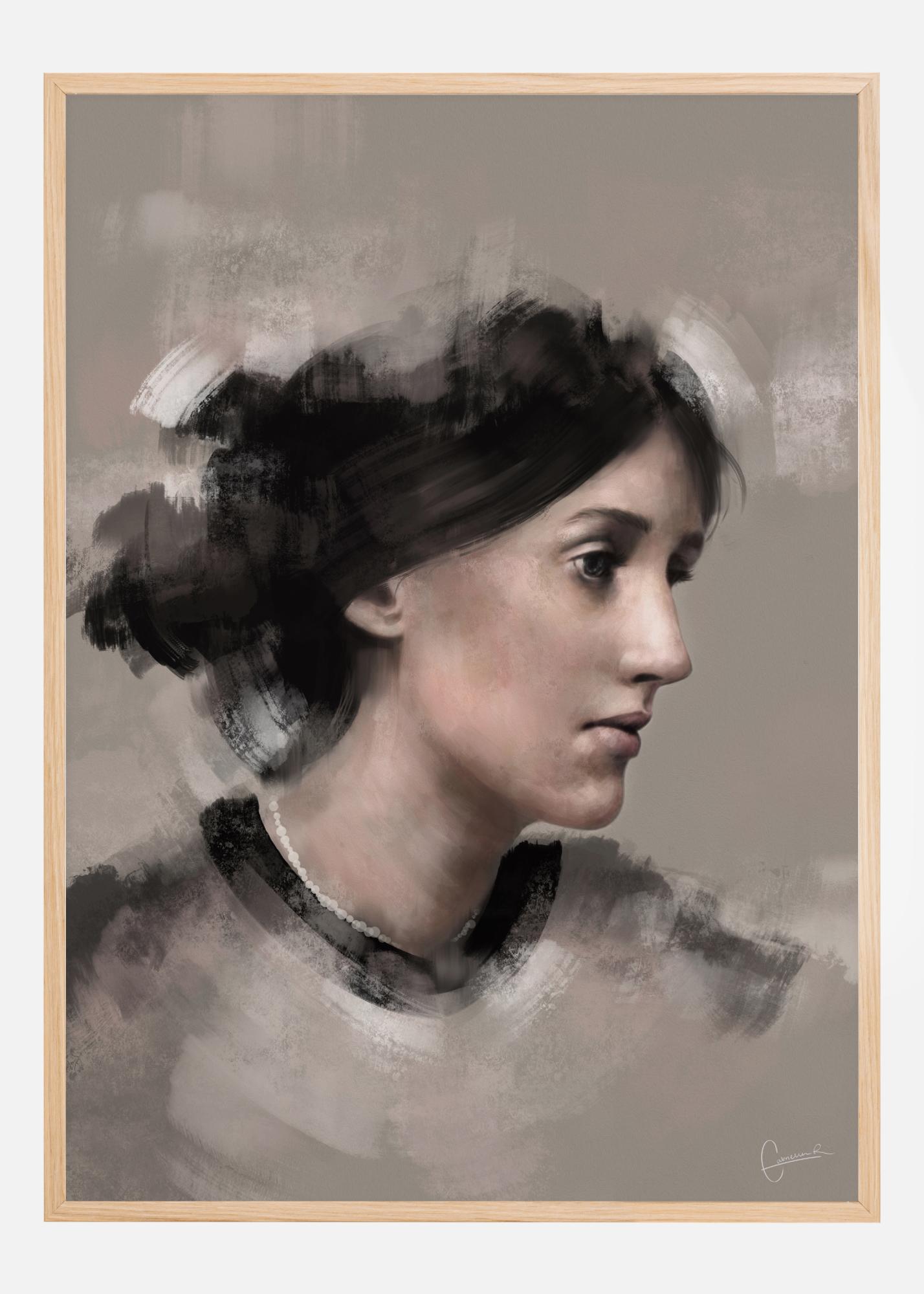 Un poster portrait de Virginia Woolf de profil. Ses cheveux sont de simples touches de peinture douce, mais son visage est rendu dans les moindres détails. Cette affiche met en relief ce visage doux et féminin et lui ajoute une note presque mélancolique lorsqu'elle regarde au loin.