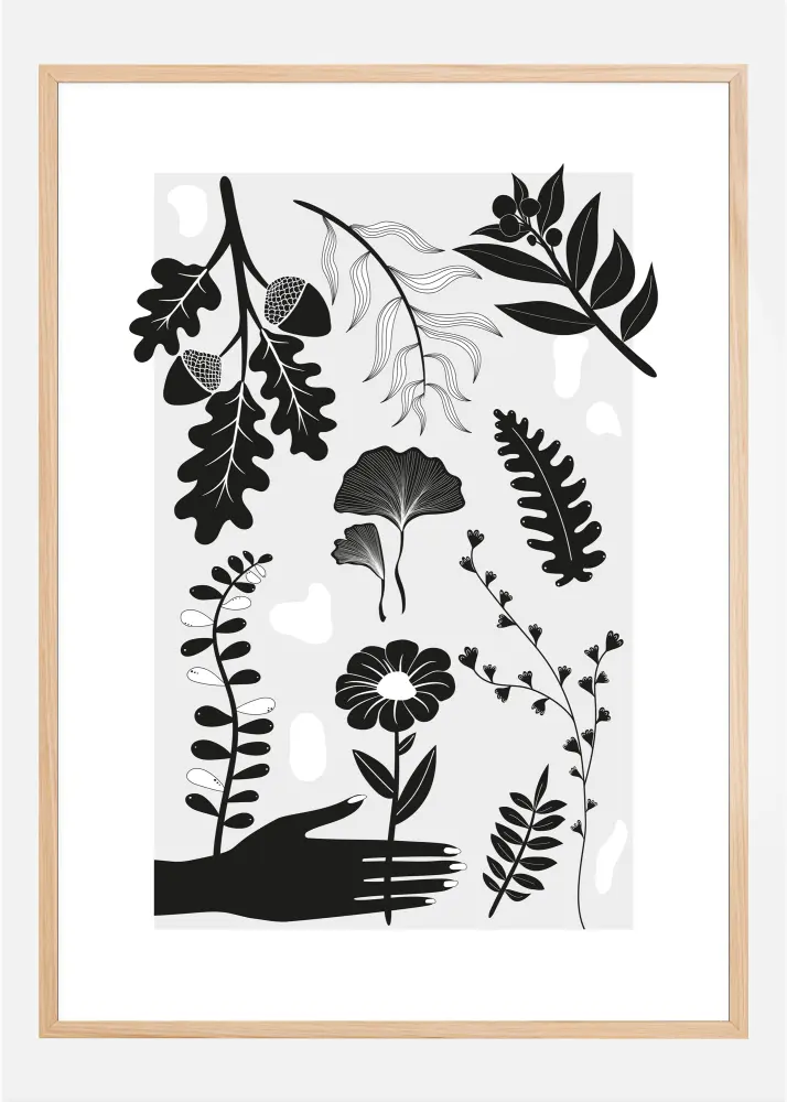 Une affiche audacieuse avec des motifs imprimés en noir et blanc de différentes feuilles, plantes et fleurs. Une main noire se tend pour saisir l'une des fleurs stylisées. Des glands, des fleurs, des fougères et autres remplissent cette impression simple mais intéressante. Ajoutez une touche botanique à votre intérieur avec ce poster de plantes.