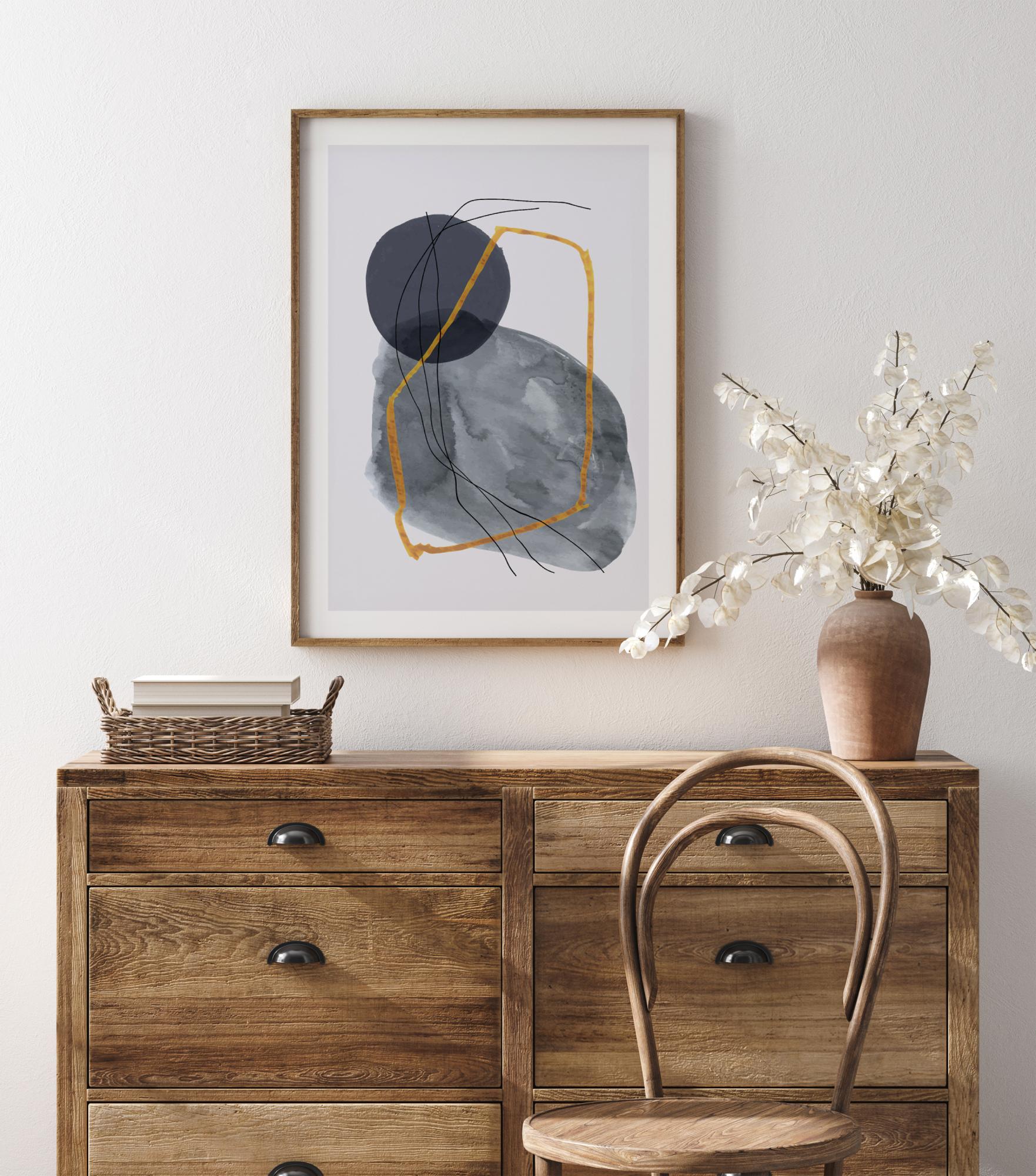Une affiche géométrique avec différentes formes bleues sur un fond gris. Une grande forme bleue de style pictural remplit l'écran avec un cercle gris doux au-dessus. Les lignes noires se faufilent à travers et une épaisse ligne dorée crée une troisième forme au-dessus pour une image sublime et attrayante.