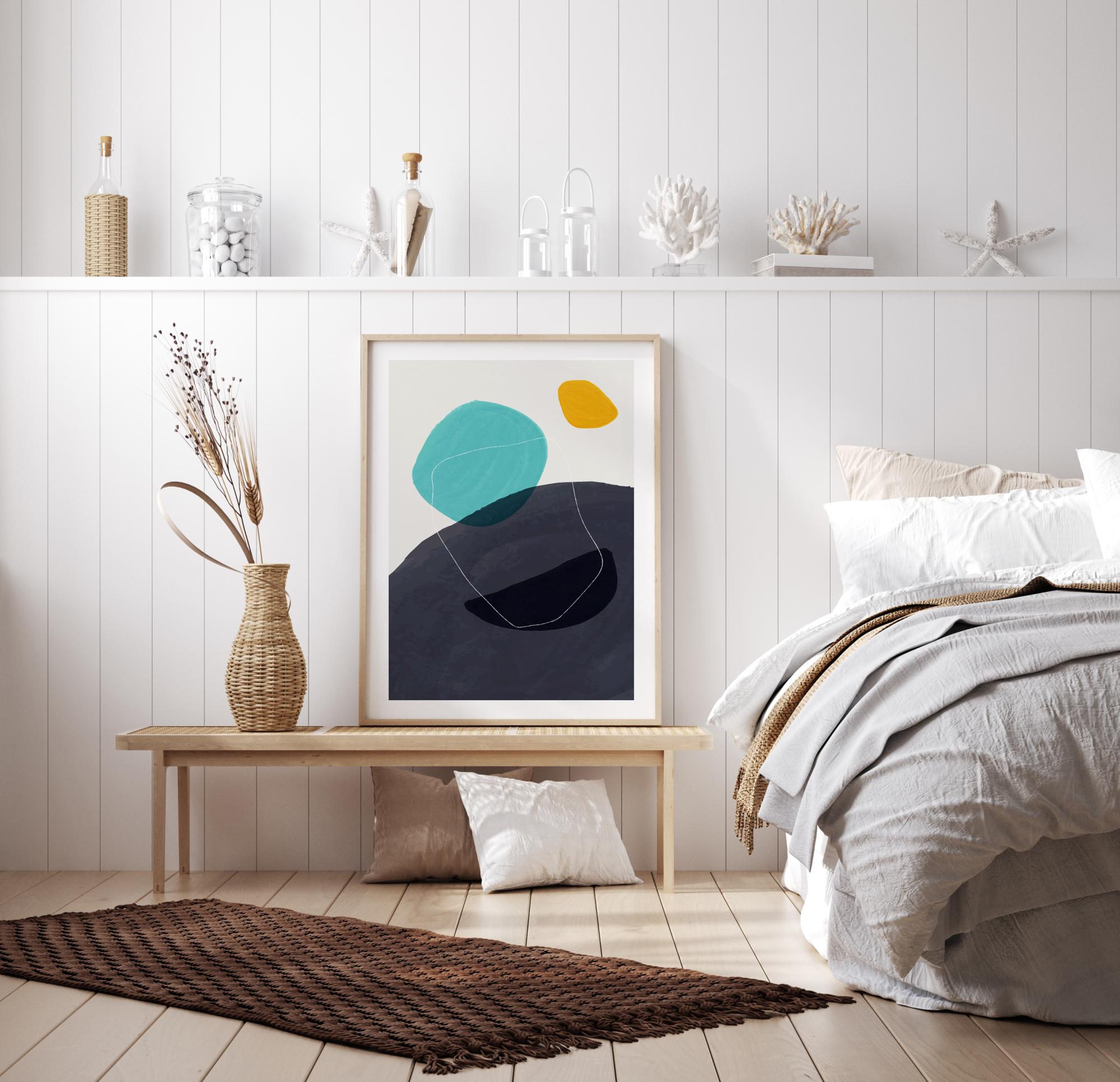 Un poster abstrait coloré avec des formes étranges de différentes couleurs. La majeure partie de l'image est remplie d'une forme grise incurvée. Au-dessus se trouve un cercle bleu layette avec une petite forme ronde orange. Des lignes blanches et une forme noire en demi-cercle recouvrent la grande forme grise. Découvrez la critique d'art qui sommeille en vous grâce à ce poster unique.
