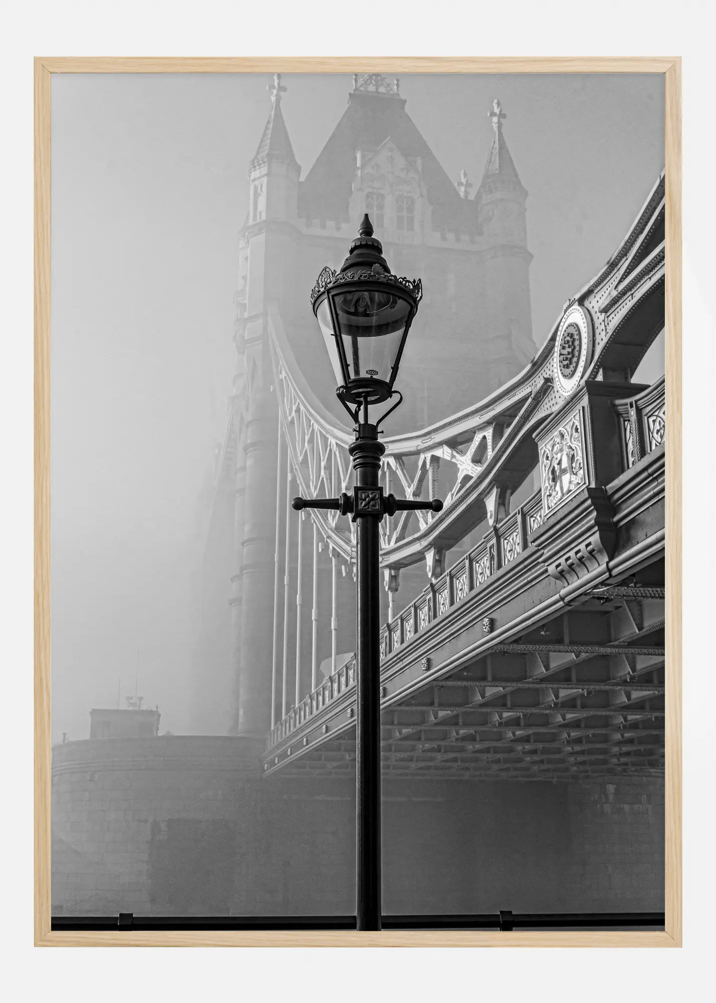 Ce poster évocateur représente une silhouette emblématique du Tower Bridge à Londres, enveloppée de brume. Le design classique du réverbère se détache au premier plan, offrant une sensation de présence historique et du charme éternel de la ville. La brume adoucit l'image et ajoute une atmosphère mystérieuse ou peut-être romantique à ce monument bien connu.
