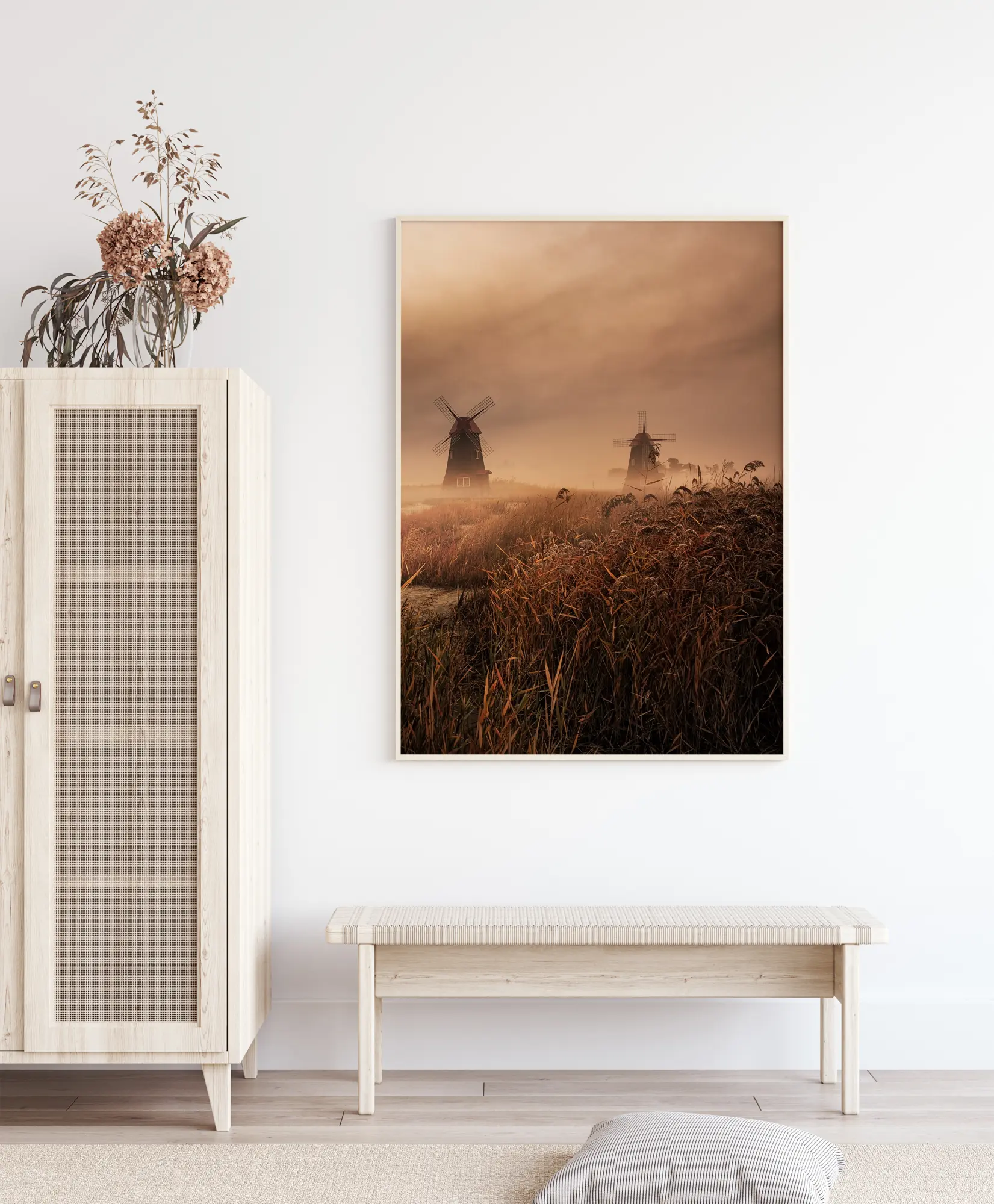 Un poster surréaliste d'un champ de blé en gros plan avec, en arrière plan, deux moulins à vent couverts de brume. L’aube, sa brume et ses nuages créent une scène aussi étonnante que mystique dans les tons sépia.