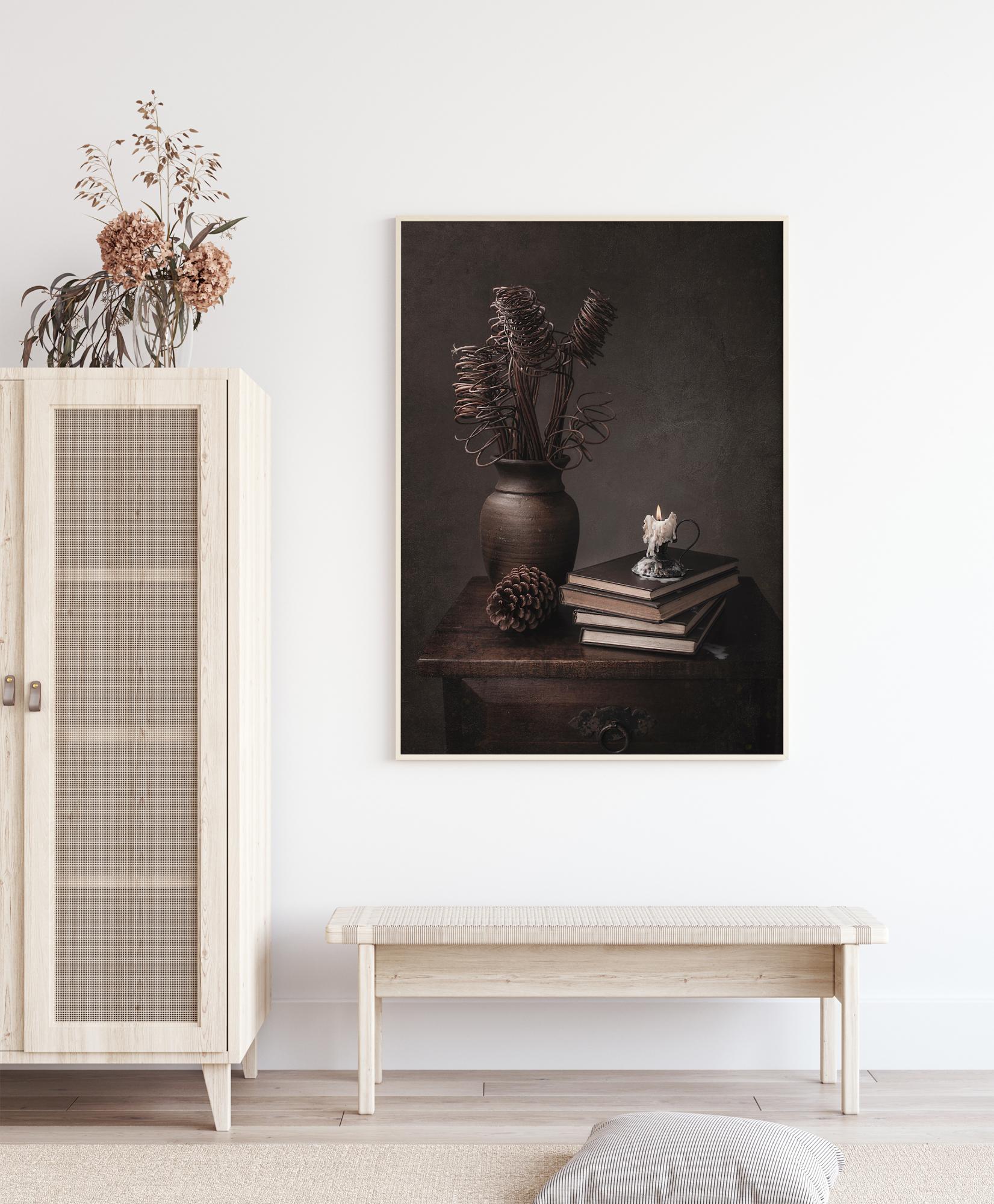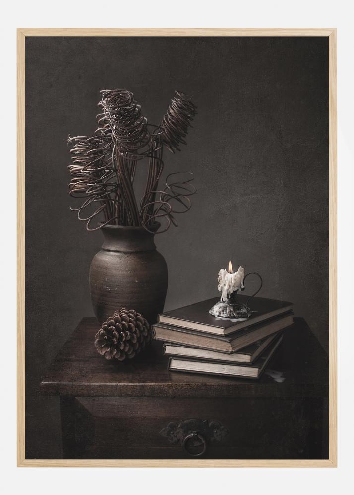 Une nature morte spectaculaire représentant une cruche, une pomme de pin, des livres et une bougie sur une vieille commode en bois. Les boucles séchées de la plante attirent le regard sur la cire fondante et la flamme de la bougie. Les couleurs sépia sombres de cette affiche donnent un peu de mystère à cette époque révolue.