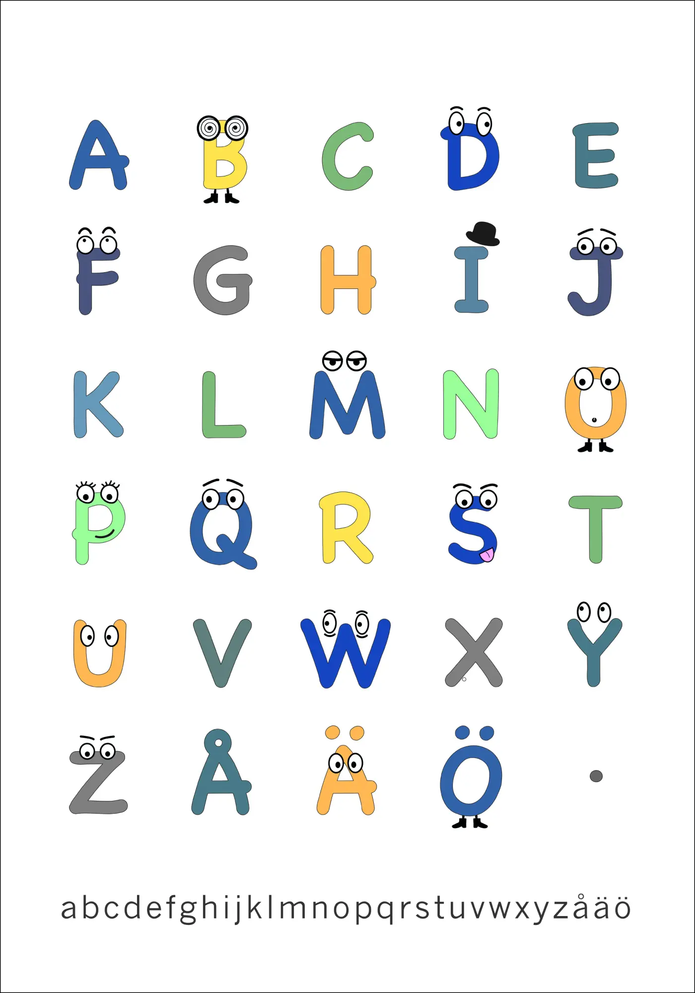 Un joli poster de l'alphabet qui montre chaque lettre d'une manière originale. Appréciez les couleurs primaires dans cette affiche simple mais mémorable. Certaines lettres ont des yeux pour créer des personnages.. Accrochez cette affiche à votre mur pour apprendre en s’amusant après l’école !