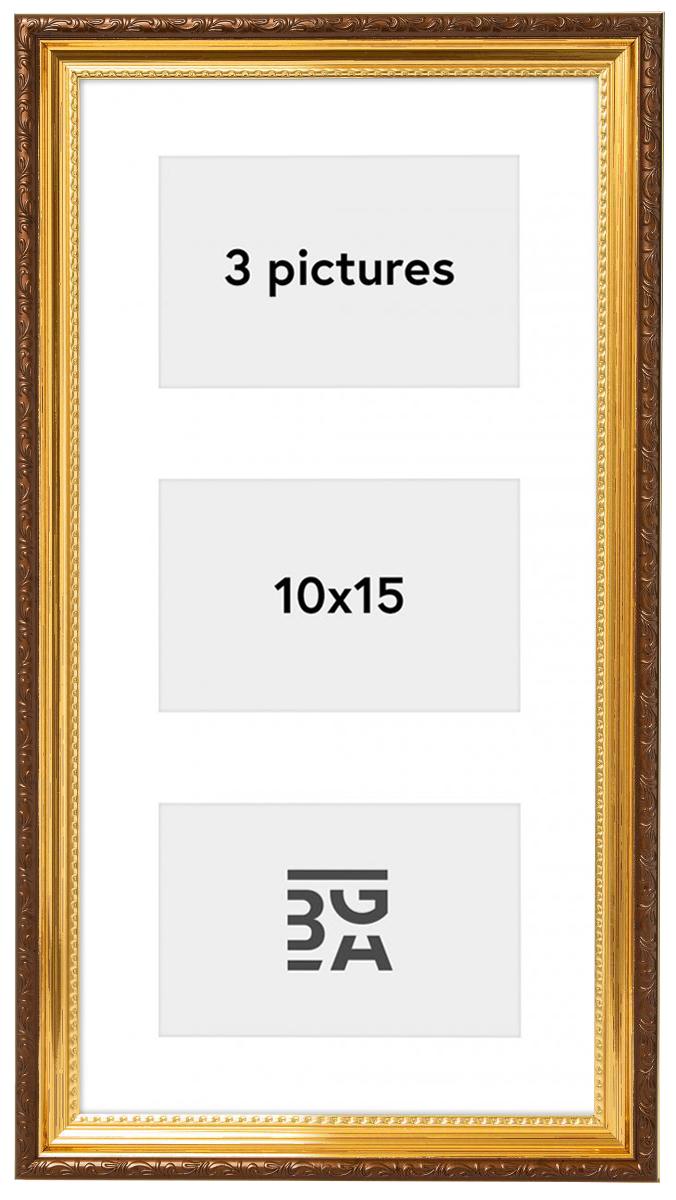 Grâce à ce cadre pêle-mêle vous avez la possibilité de décorer votre mur avec images de la famille, des amis ainsi que des photos souvenirs de superbes moments vécus. Le cadre contient assez de place pour 3 images de taille 10x15 cm. Ce cadre de couleur dorée est dans un joli style rétro et sa bordure externe décorative se présente dans une nuance brune chaude. Supports muraux inclus.