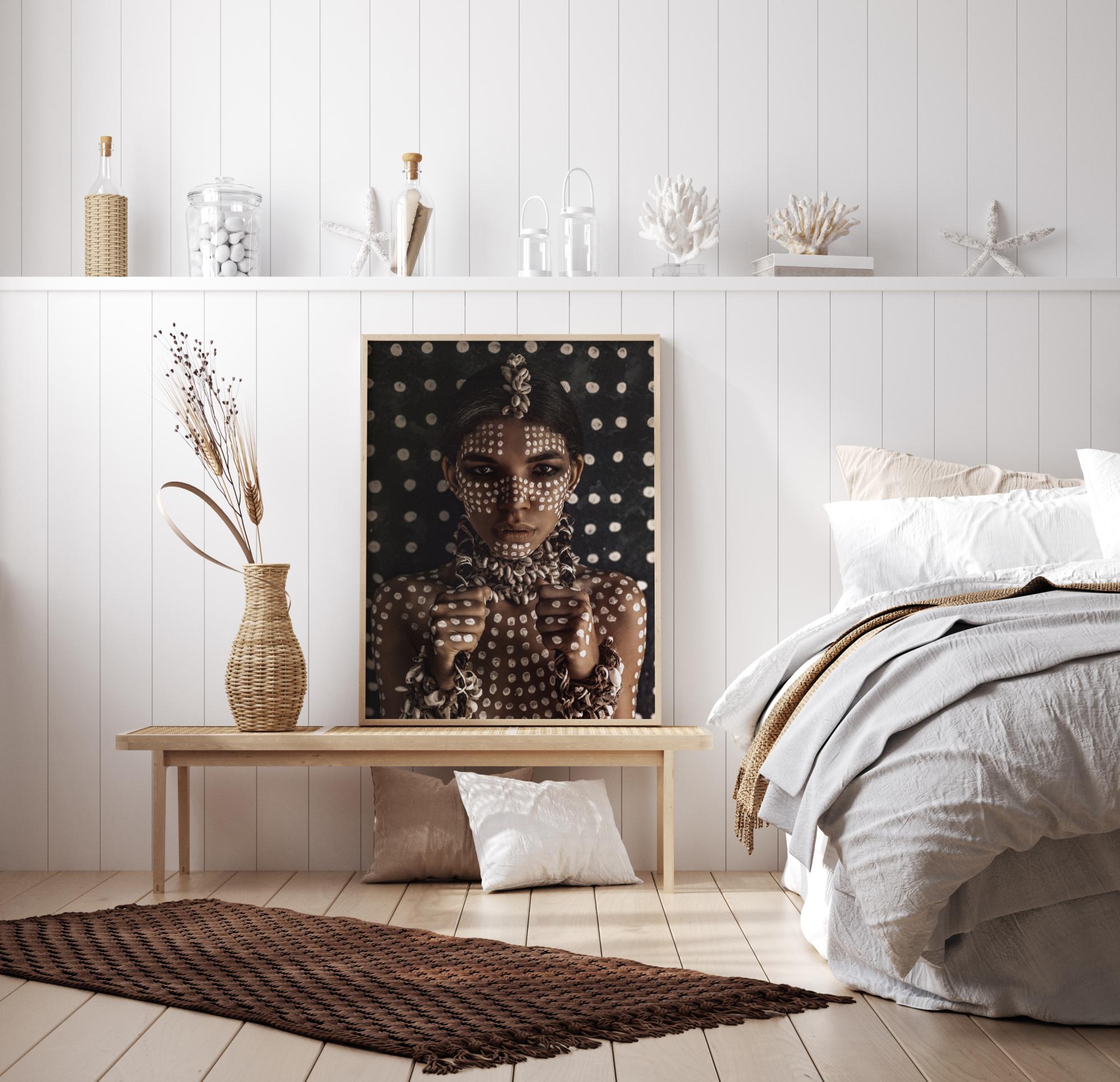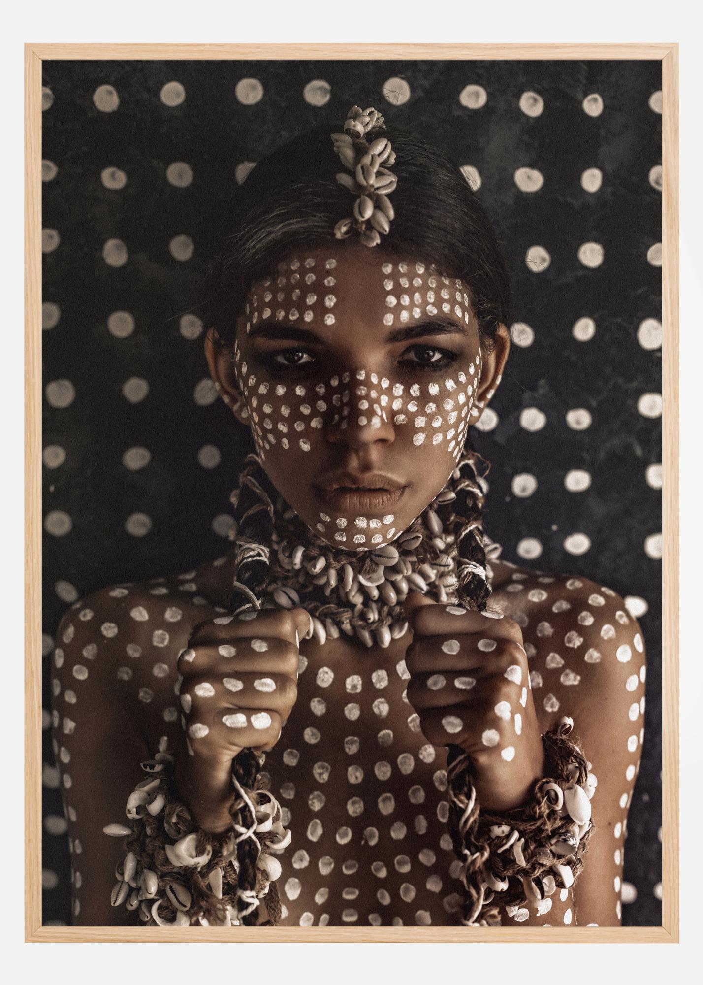 Vous êtes accueilli par le regard soutenu d'une jeune aborigène aux peintures corporelles blanches et portant de beaux bijoux en corde naturelle et coquillages. Un poster d'art photographique terre-à-terre qui se distingue aussi bien en majesté solitaire que sur un mur de tableaux moderne.