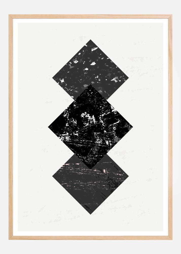 Une affiche géométrique avec trois carrés foncés assis sur leurs pointes. Deux carrés bleu marine sont placés au-dessus et au-dessous d'un grand carré noir. Tous sont soulignés par des taches et des mouchetures blanches qui créent un ensemble intéressant de motifs. Associez-le à un mur bleu et faites ressortir ces formes.