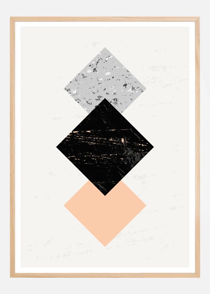 Une affiche géométrique avec trois carrés de couleurs différentes. Une pièce plus douce, le point central est un carré noir foncé, mais il est adouci par un carré bleu au-dessus, et un carré rose en dessous, chacun avec des motifs supplémentaires. Ajoutez un peu de spectacle à votre hall d’entrée ou une pièce bénéficiant d’une lumière naturelle, sans pour autant être envahissant.
