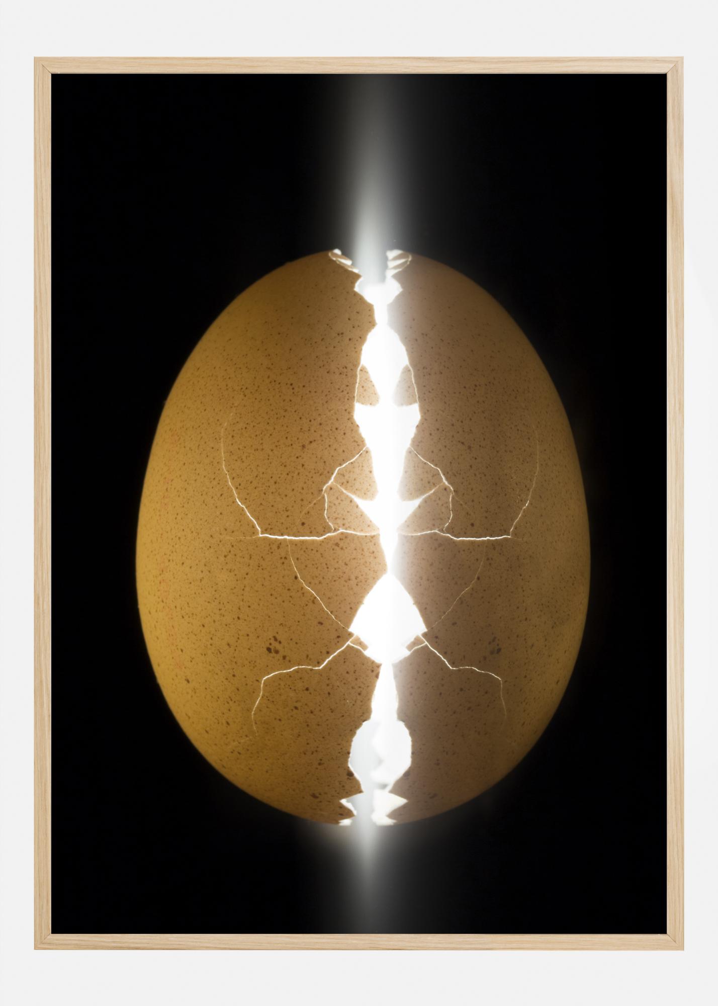 Une affiche abstraite spectaculaire représentant un œuf qui se brise, avec une lumière vive qui en émane, le tout sur un fond noir. La lumière se fissure à travers l'œuf en un étonnant motif symétrique. Les faisceaux de lumière percent l'obscurité pour créer une image abstraite, mais fascinante, parfaite pour n'importe quel mur de votre maison.