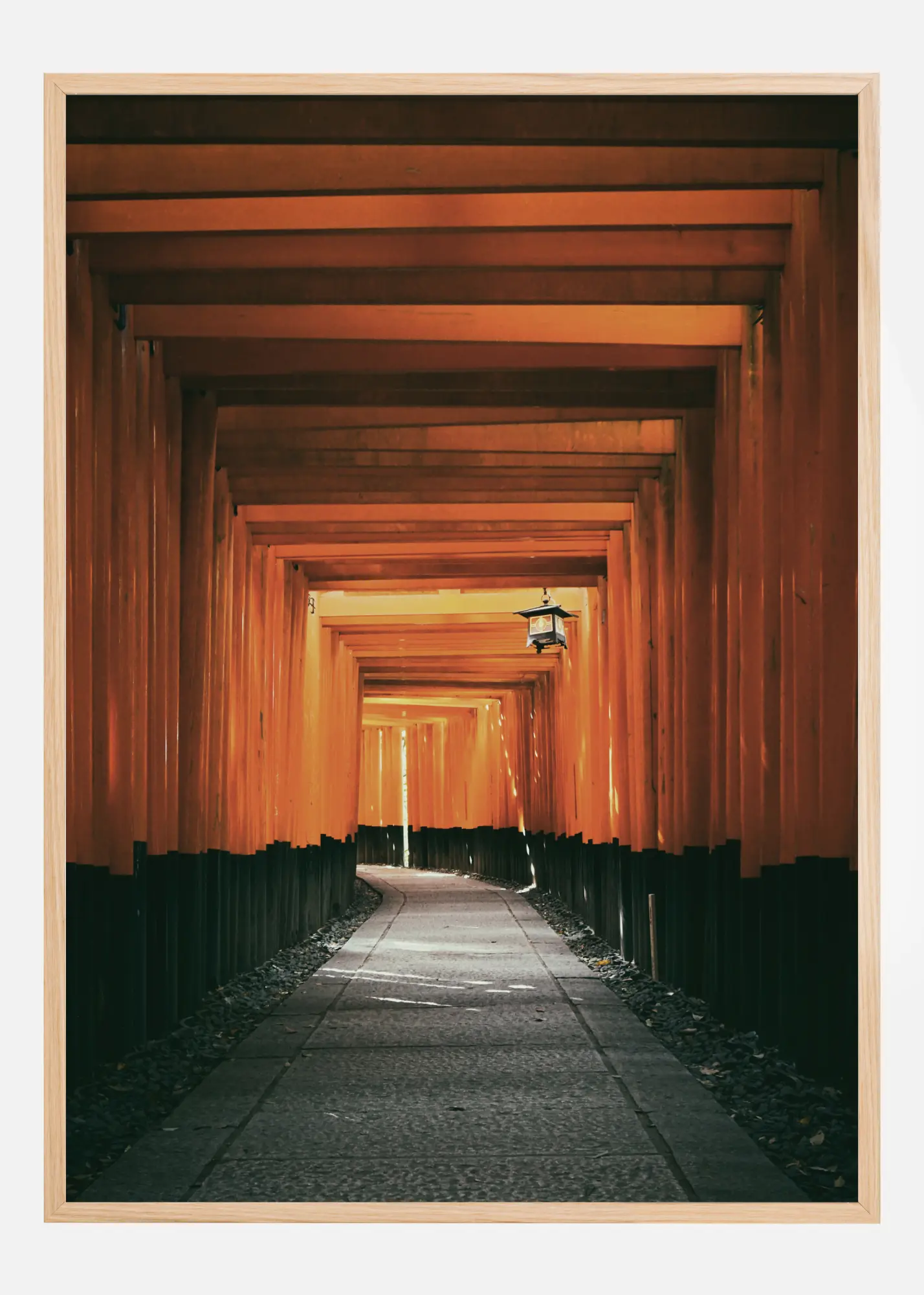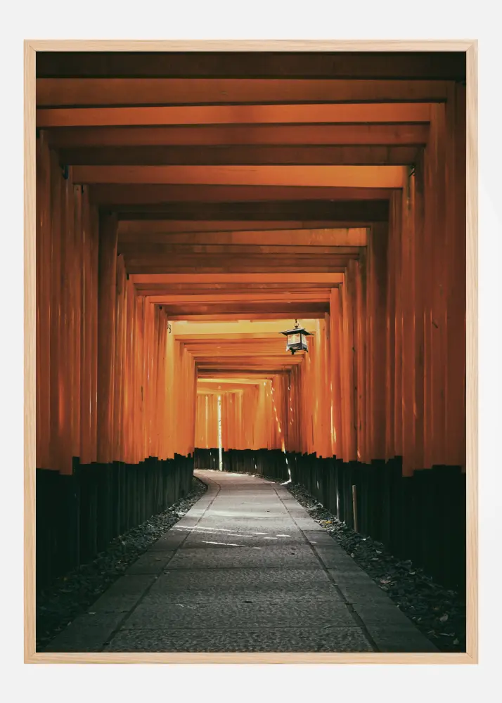 Une affiche géométrique brune représentant un chemin à travers un tunnel abstrait. Les pierres gris foncé du chemin s'accordent avec les tons chauds du toit en bois qui s'éclaircissent au loin. Des fissures de lumière apparaissent à travers les planches de bois et une lanterne est suspendue pour éclairer le chemin. Accrochez-la pour une ambiance sereine.