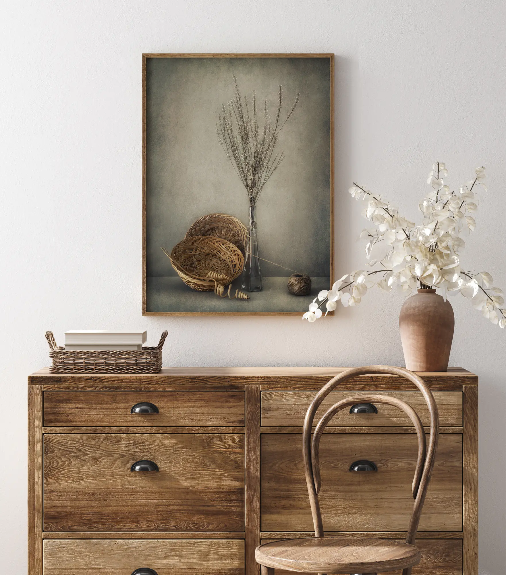 Une affiche de nature morte composée de paniers en osier, d'un pot en argile, d'un flacon en verre et d'herbes séchées. La pièce présente des tons sépia et gris subtils, ce qui en fait une pièce douce et harmonieuse. Apportez un peu de tranquillité dans votre maison avec ce poster ! Associez-le à un mur neutre pour qu'il ne soit pas surchargé.