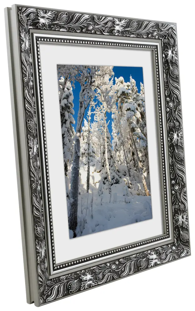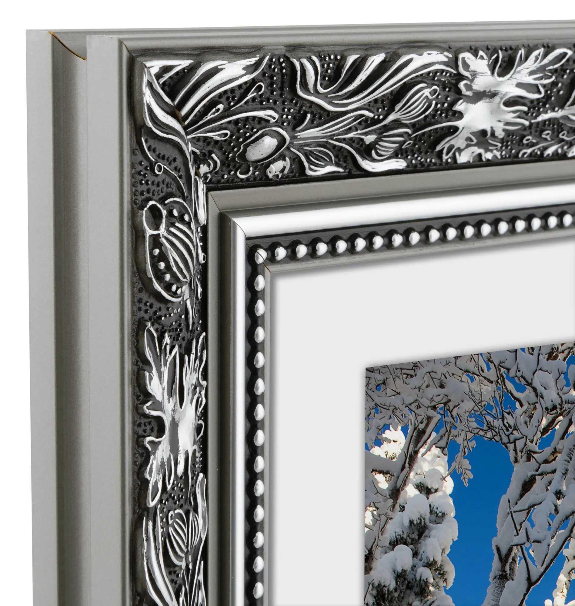 Rendez votre mur somptueux tout en attirant une attention particulière sur votre image ! Ce superbe cadre a un double profilage qui est très joli sur le mur. Les bords sont entièrement argentés, tandis que la face avant est noire avec un motif argenté avec des feuilles et des formes sinueuses. Au plus près du verre se trouve un bord argenté et une partie noire avec un motif de perles en argent. Puisque le cadre est fait à vos mesures, vous pouvez être sûr qu'il conviendra exactement où vous le souhaitez.