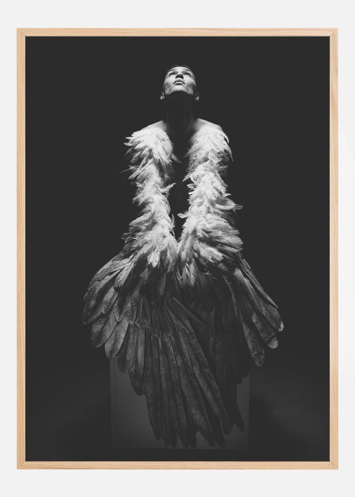 Une affiche portrait d'un homme portant une tenue à longues plumes pour imiter le vol. Il se tient debout sur un fond noir uni et regarde fixement vers le ciel. Un projecteur éclaire son visage et ses épaules pour que vous vous concentriez sur lui lorsque vous regardez cette œuvre spectaculaire.