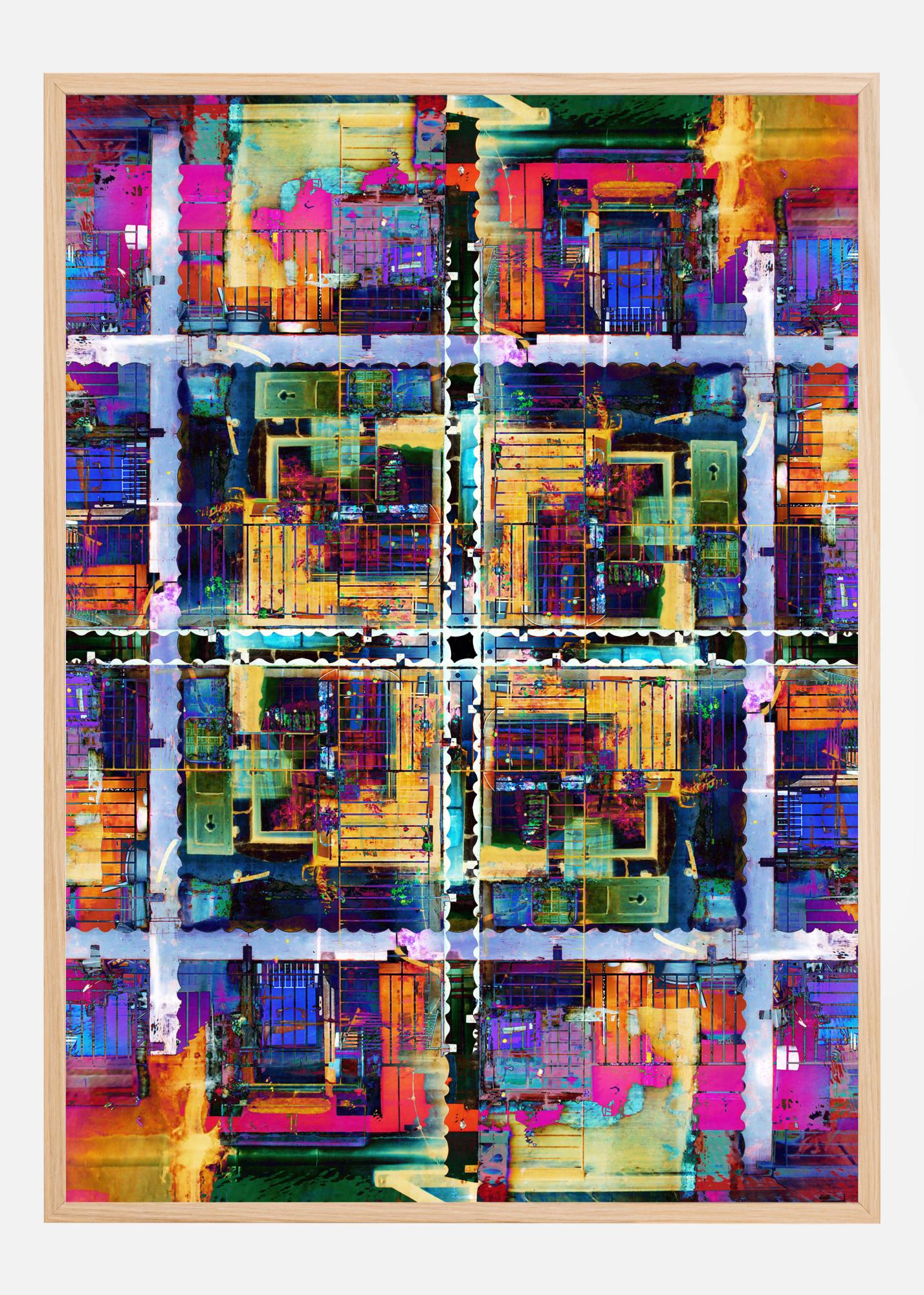 Une affiche au néon pleine de motifs abstraits. Un arc-en-ciel de couleurs comme une marée noire remplit cette image qui ressemble à des coupes transversales de pièces. Chaque carré est rempli d'une explosion de couleurs, ce qui en fait une œuvre fascinante à regarder pendant des heures - à associer de préférence à un mur neutre.