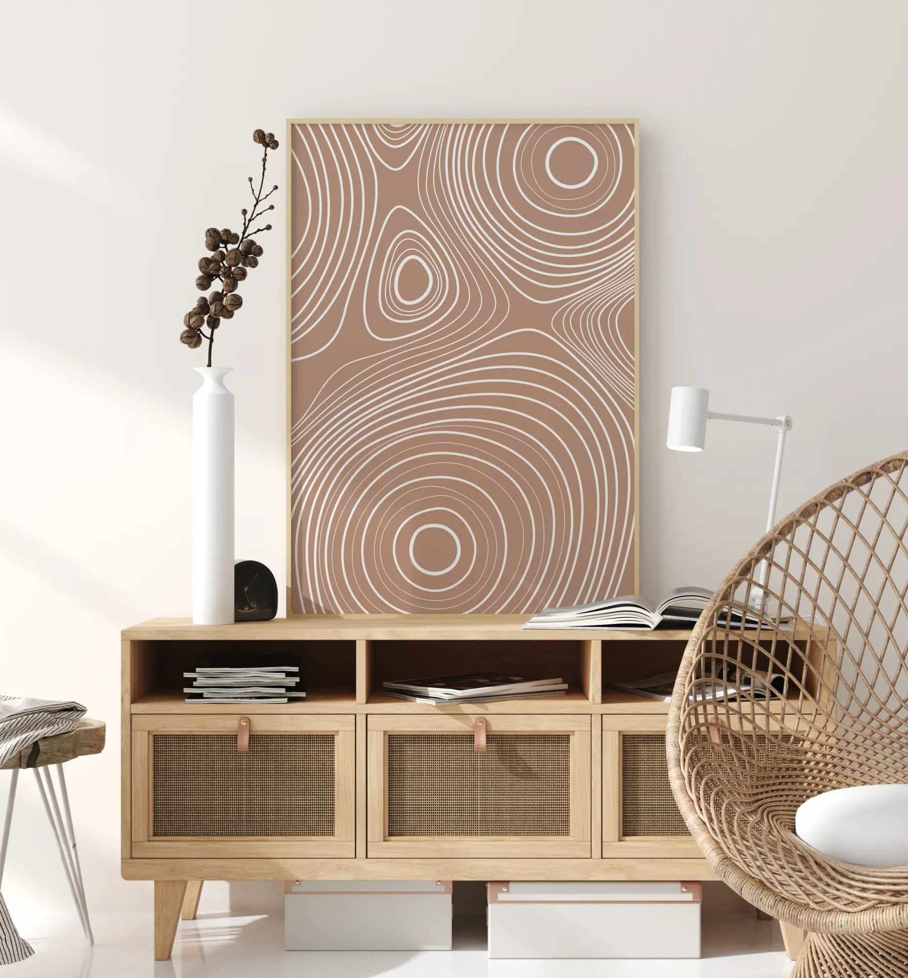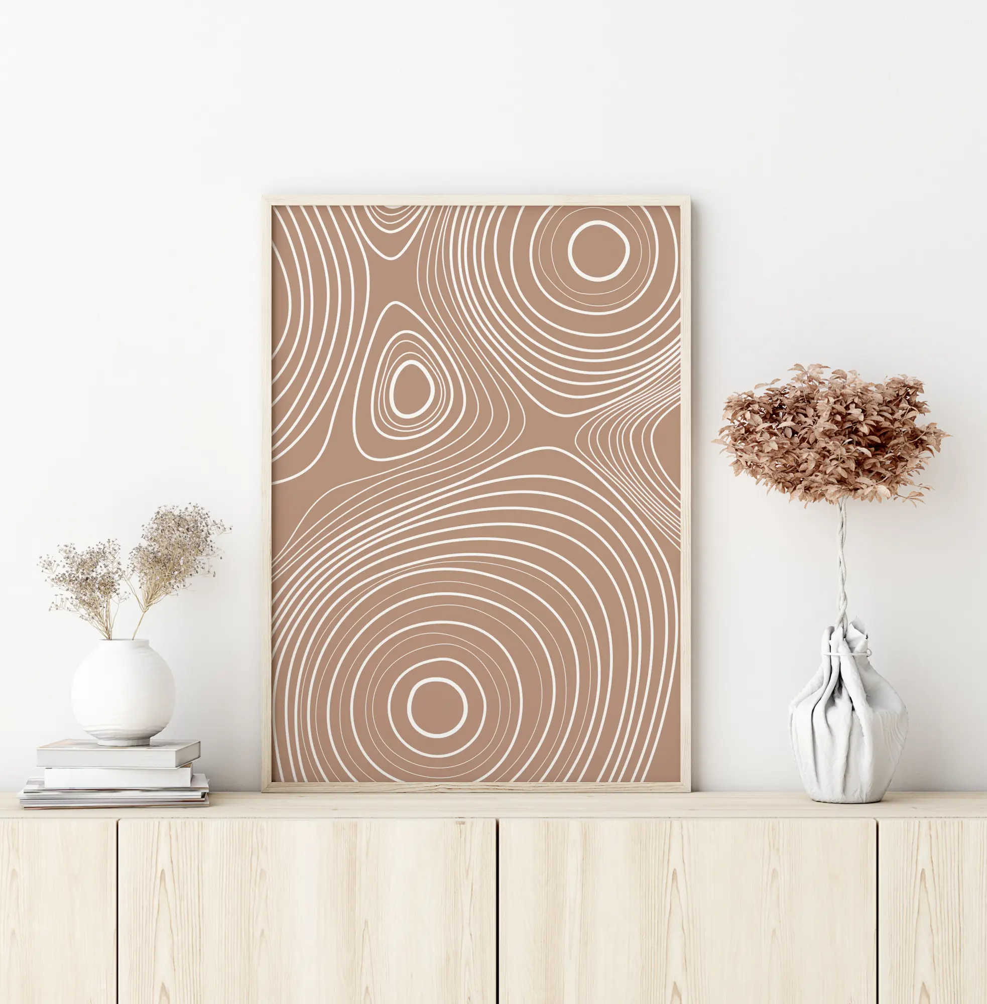 Une affiche abstraite tourbillonnante de lignes blanches sur un fond brun pâle. Observez les anneaux blancs qui s'étendent en spirale vers l'extérieur dans cette image étonnante. Vous pouvez vous perdre dans ces tourbillons apaisants. Accrochez ce poster paisible dans votre maison : il est parfait pour une salle de bain ou une salle de repos.