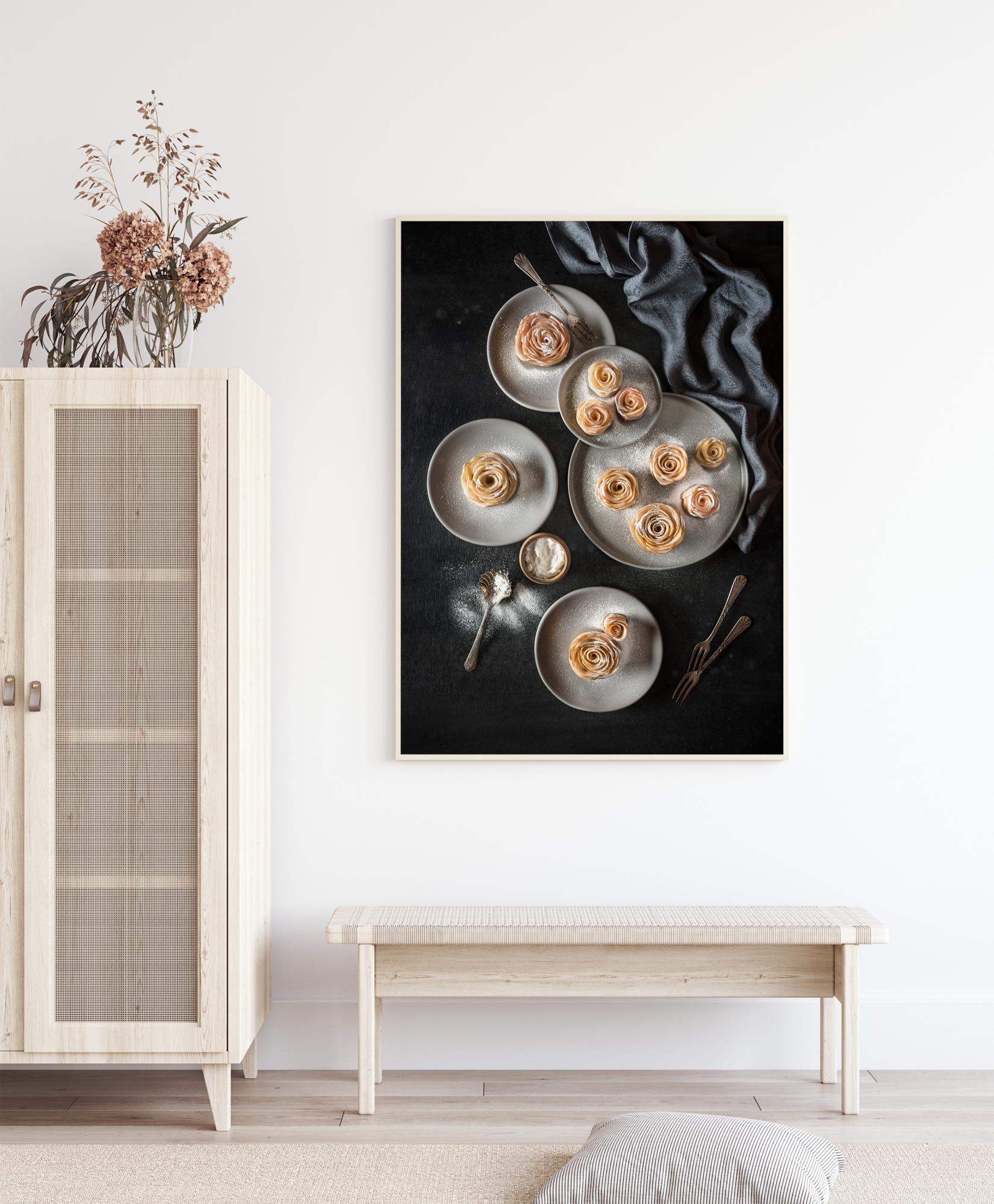 Une affiche simple pour l’heure du goûter avec des plateaux de différentes pâtisseries sucrées. Ces tartelettes aux pommes sont incroyablement délicates, en forme de roses fragiles et saupoudrées de sucre. Les assiettes blanches et la pâte dorée croustillante se détachent sur la nappe noire. Cette affiche vous mettra l’eau à la bouche en passant devant.