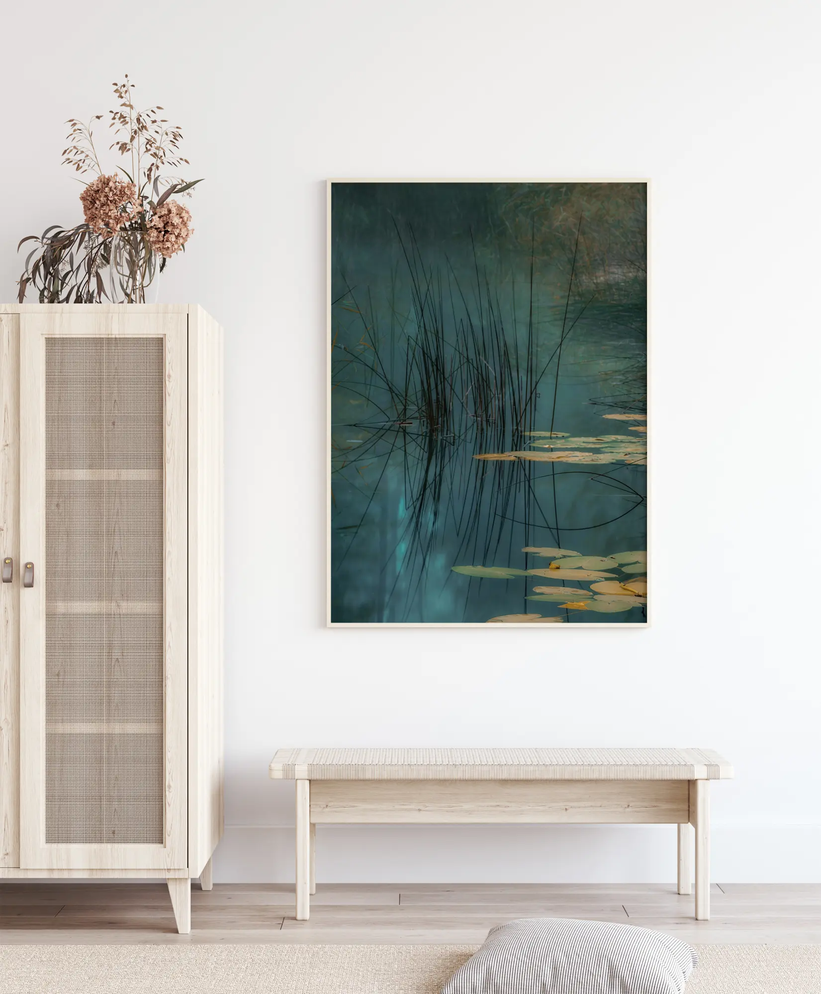 Une affiche nature représentant un superbe lac bleu lagune rempli d’herbe et de nénuphars. Les couleurs douces se mélangent pour créer une image vraiment sereine. Les eaux calmes créent des reflets parfaits sur les roseaux. Ne faites plus qu'un avec la nature en plaçant ce poster sur votre mur et accueillez la paix.