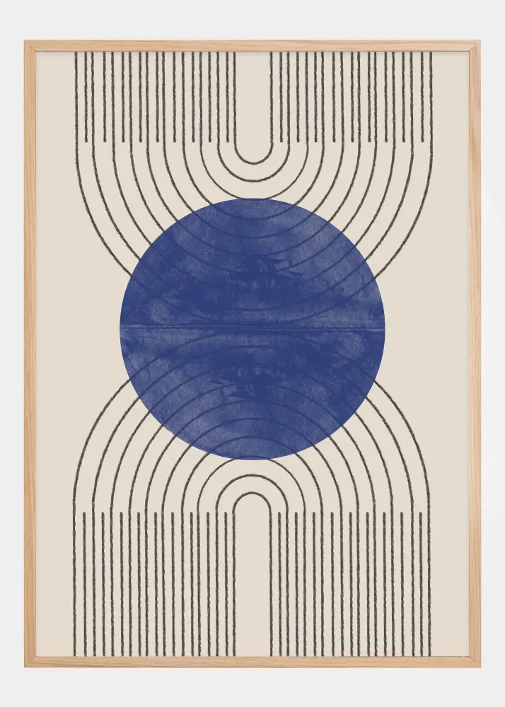 Créez une atmosphère calme et sereine dans votre pièce avec notre affiche abstraite qui mélange des lignes douces et des couleurs audacieuses. Le grand cercle bleu au centre donne une sensation palpable de tranquillité et est comme un portail vers un autre monde, encadré par une série d'arcs concentriques qui créent une sensation architecturale. Cette œuvre d'art mélange tradition et modernité et apporte un équilibre paisible à votre environnement.