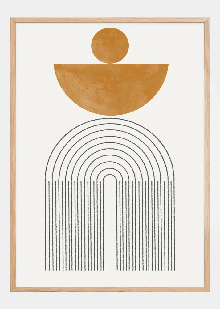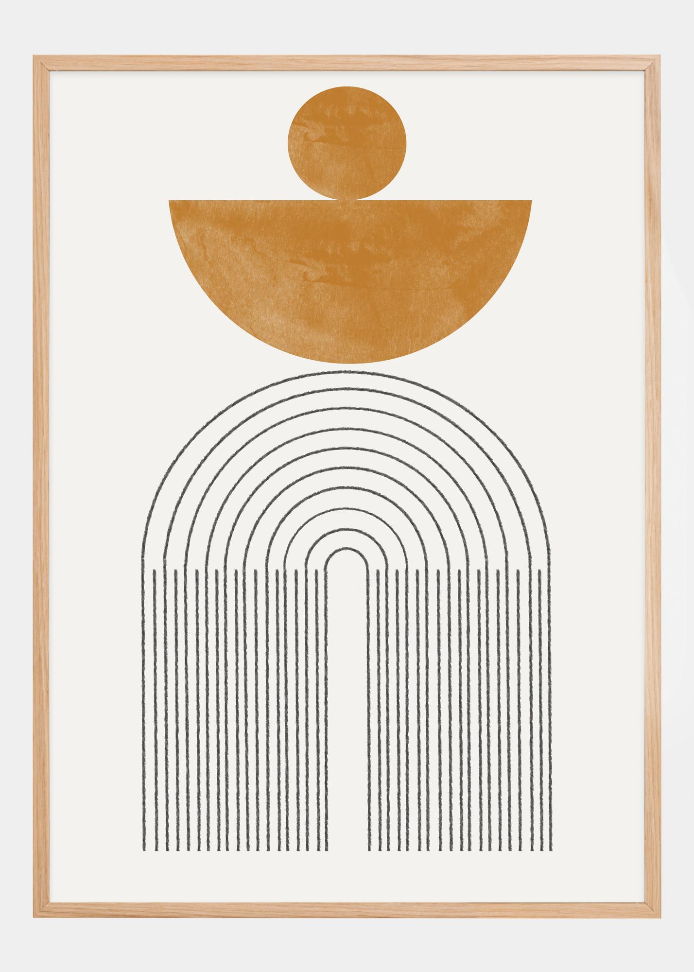 Cette affiche élégante unit des formes organiques et des lignes épurées dans une composition à la fois apaisante et visuellement intéressante. Un grand demi-cercle couleur ocre est placé comme un coucher de soleil au-dessus d'une série d'arcs, créant une sensation architecturale d'espace et de profondeur. En haut, le design est équilibré par un cercle plus petit, rappelant la trajectoire du soleil à travers le ciel.