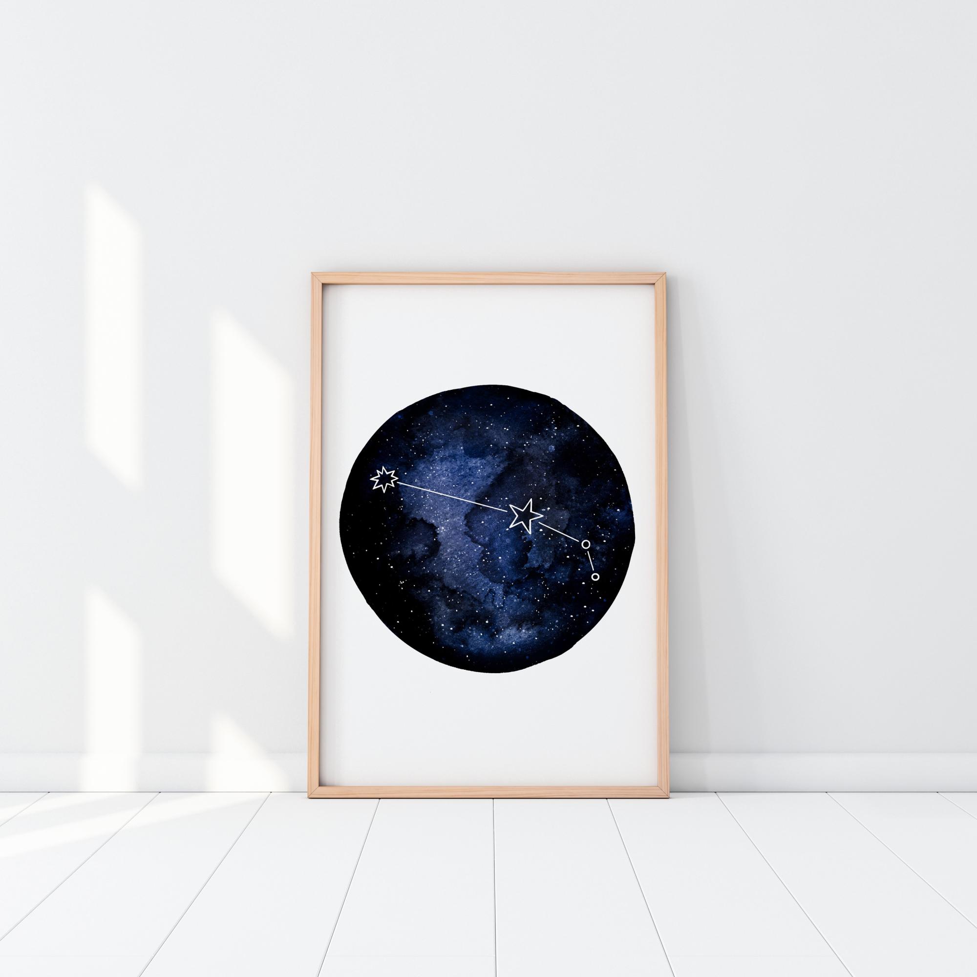 Une affiche abstraite du signe astrologique du Bélier. Un globe bleu foncé suspendu contient une image de la galaxie ainsi que les contours du signe astrologique. Le globe est posé sur une toile de fond blanche unie. Ajoutez ce poster à n'importe quel mur de votre maison et voyez si vous pouvez repérer cette constellation dans le ciel nocturne.