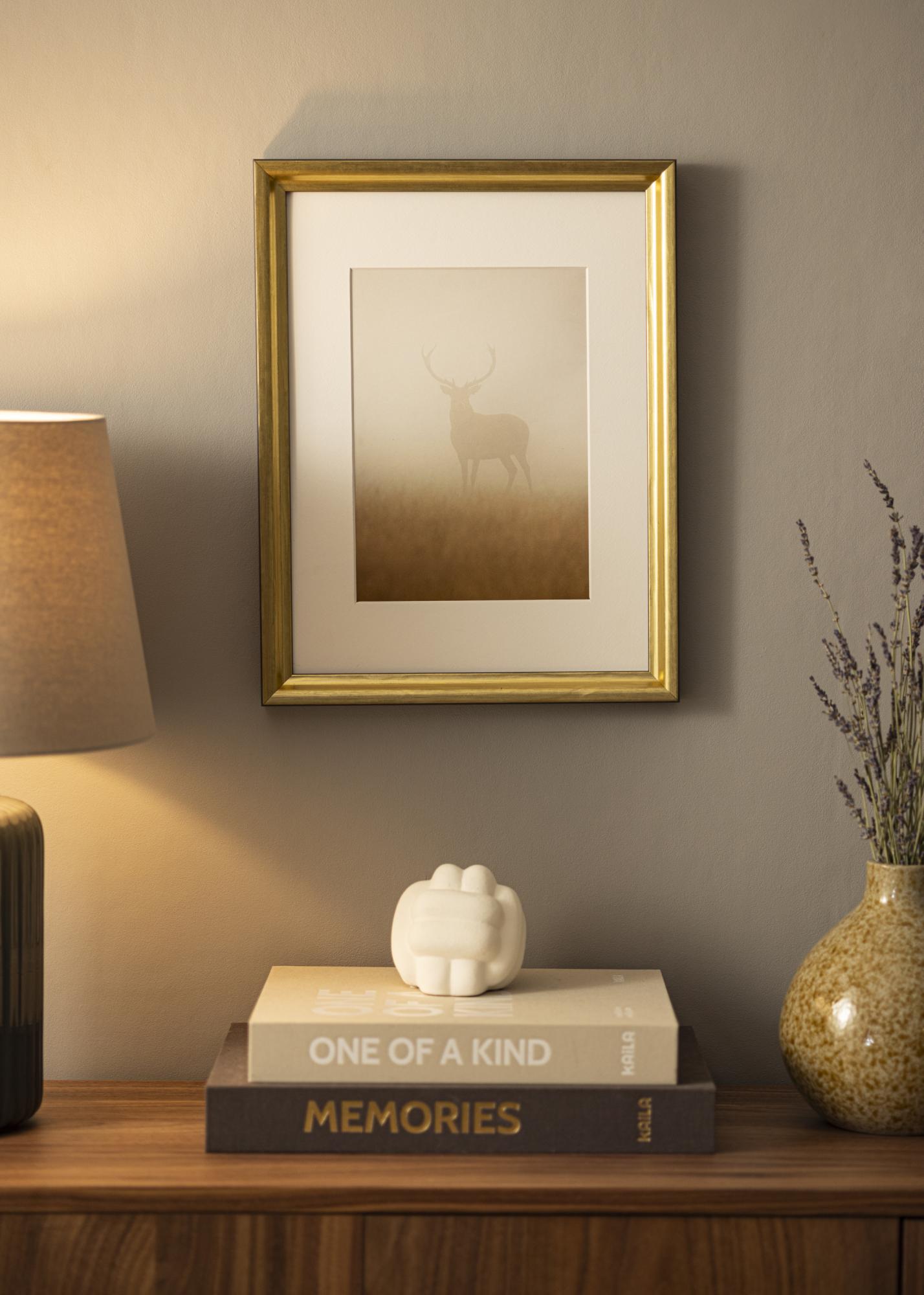 Cadre doré élégant de taille moyenne qui s'adapte à presque tous les types de motifs et de contextes. Le cadre a une agréable couleur dorée avec des tons noirs qui donnent une impression agréable et sobre.