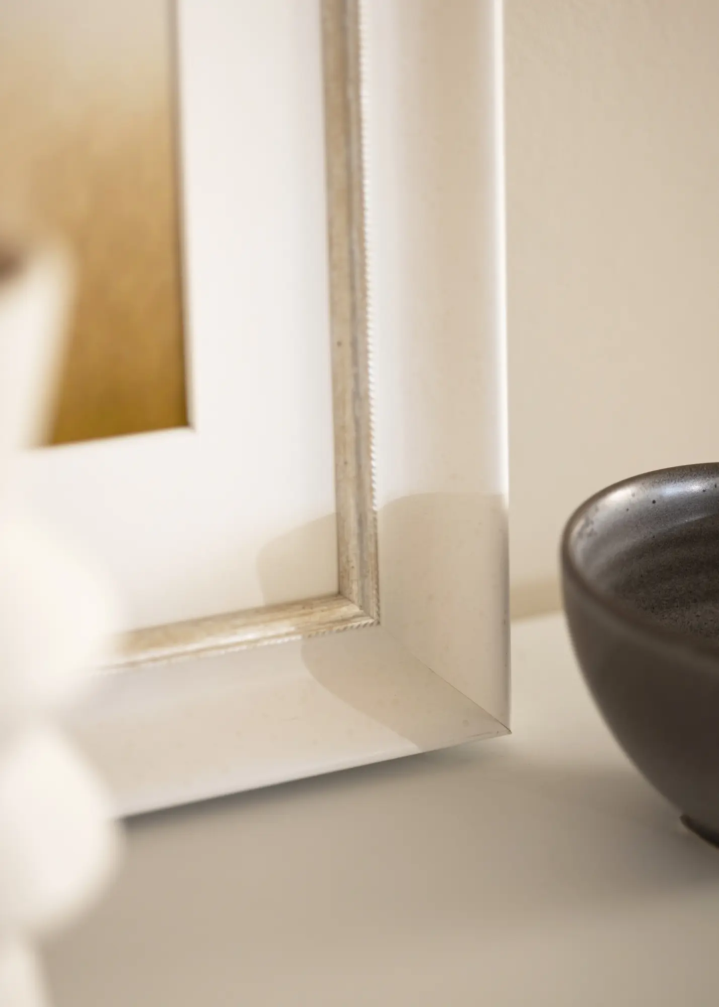 Cadre solide dans toutes les tailles avec un profil classique blanc. Au plus près du motif se trouve un élégant bord argenté qui donne au cadre un éclat supplémentaire.