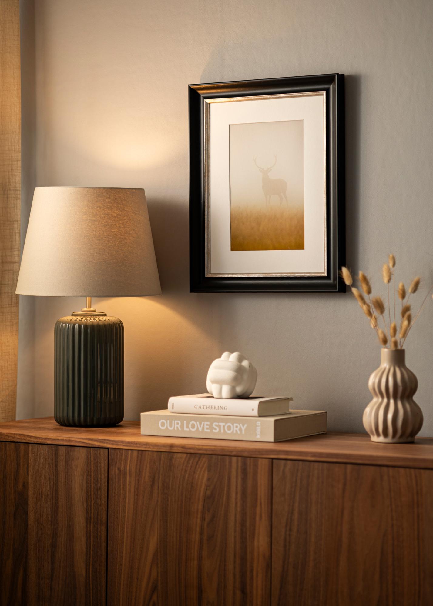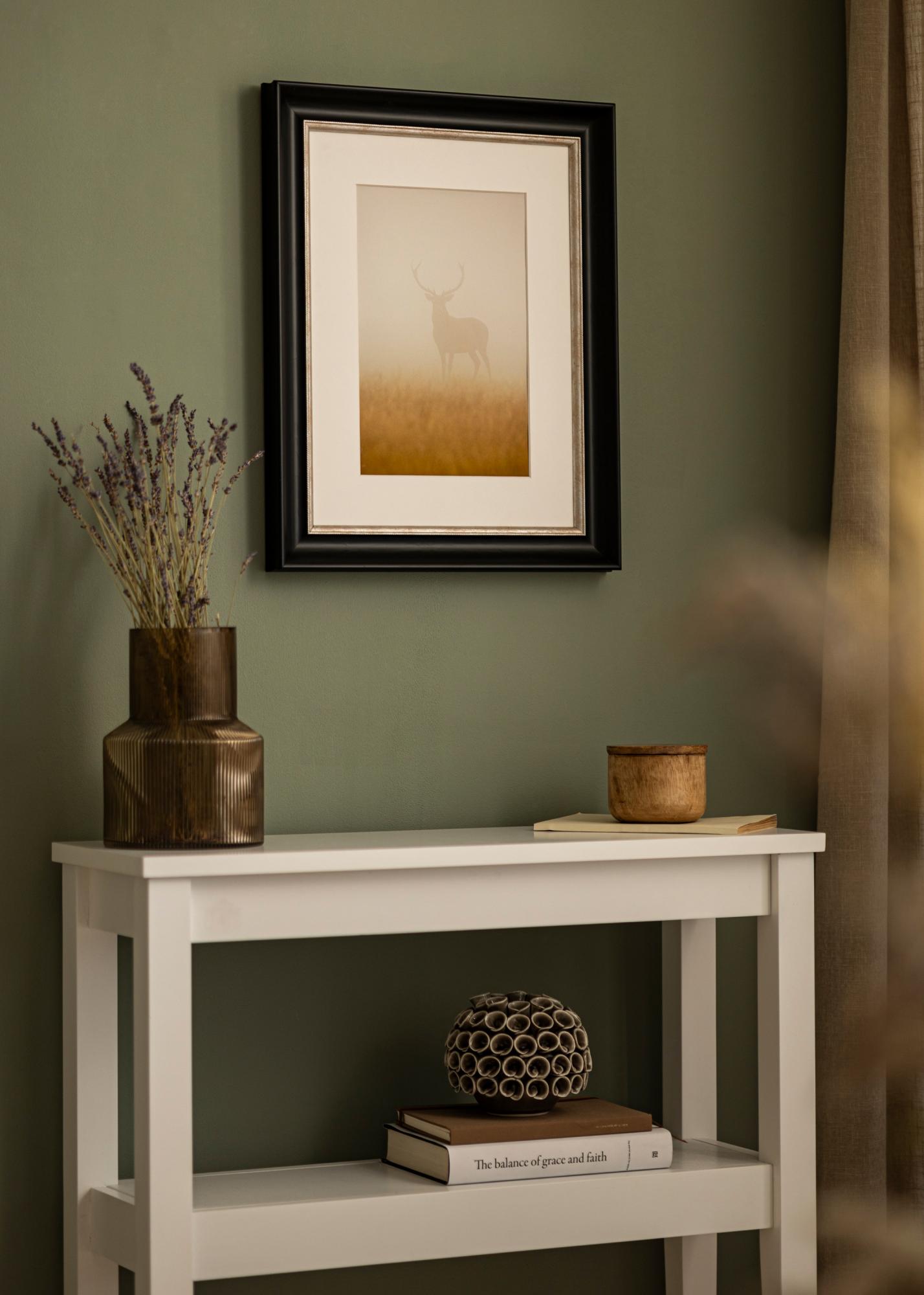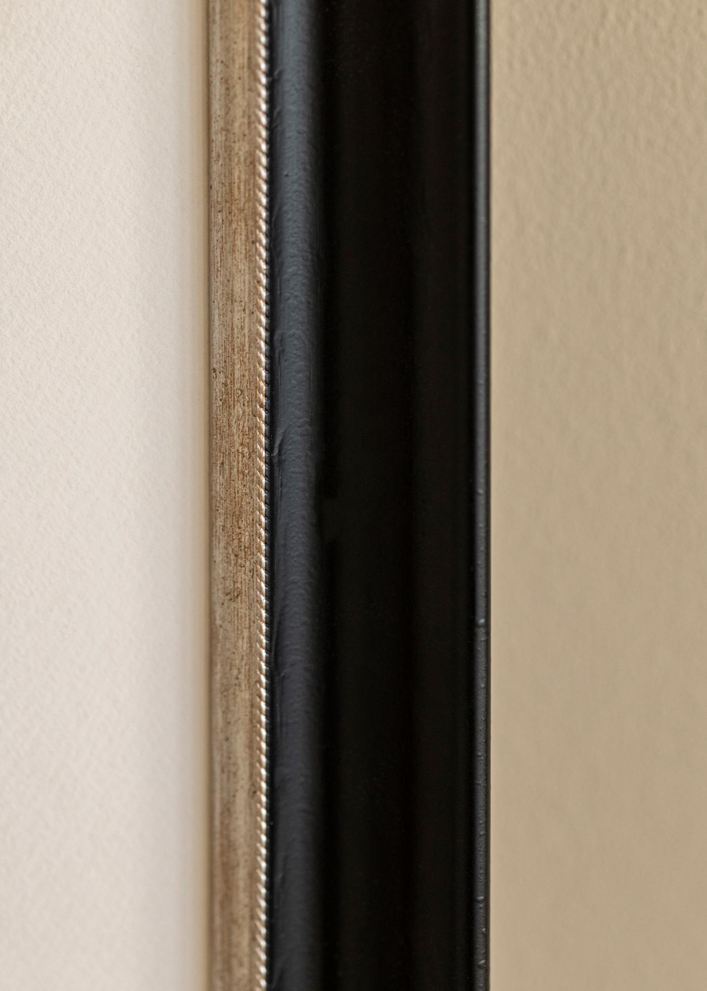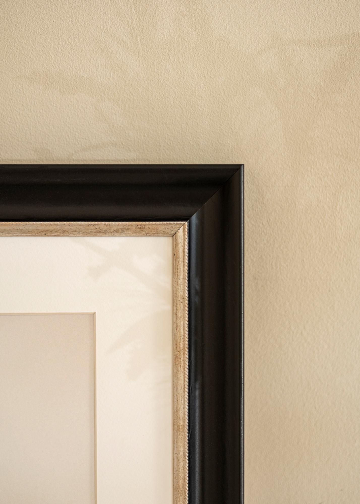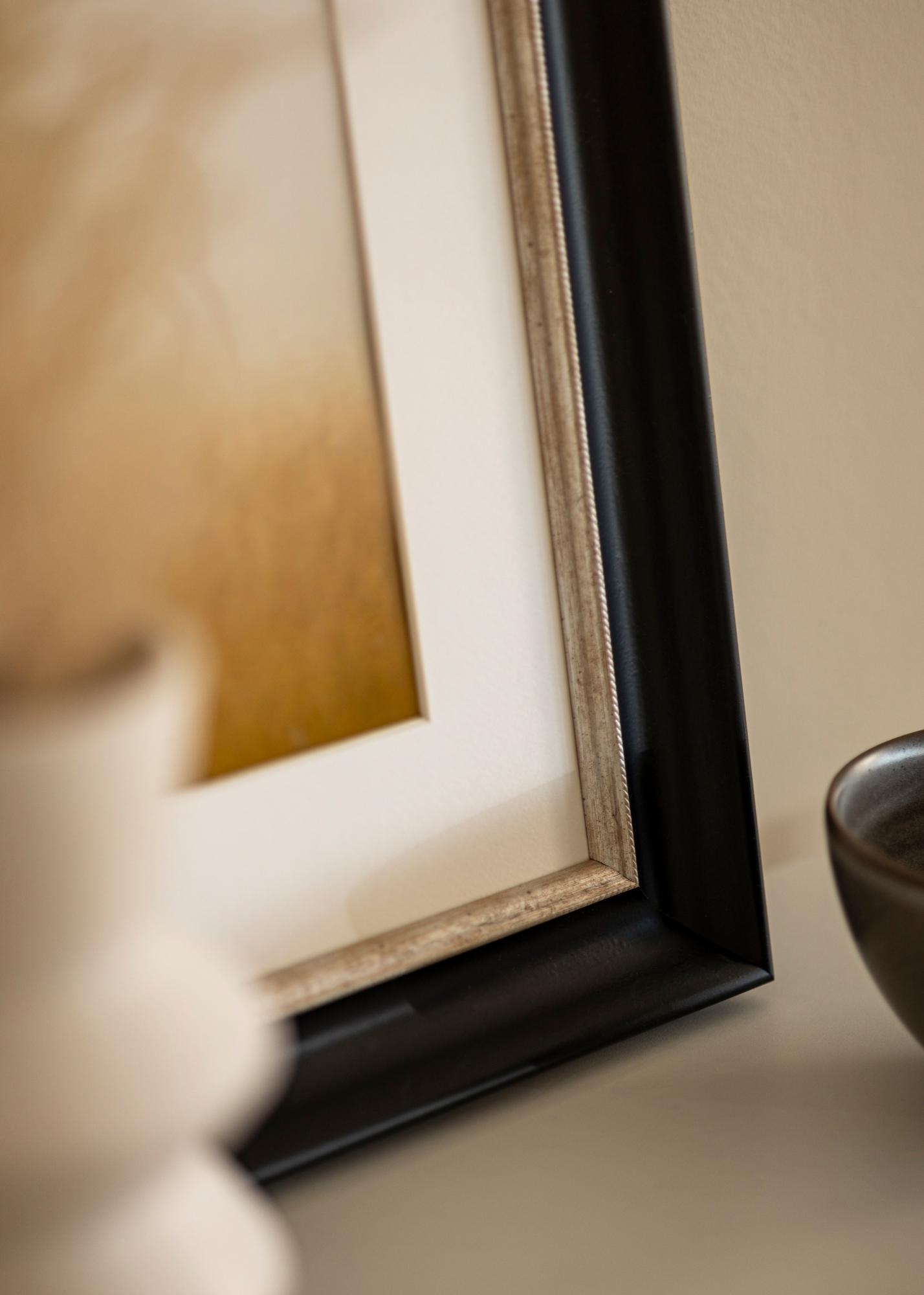 Cadre luxueux dans toutes les tailles avec un profil classique noir. Au plus près du motif se trouve un élégant bord argenté qui donne au cadre un éclat supplémentaire.