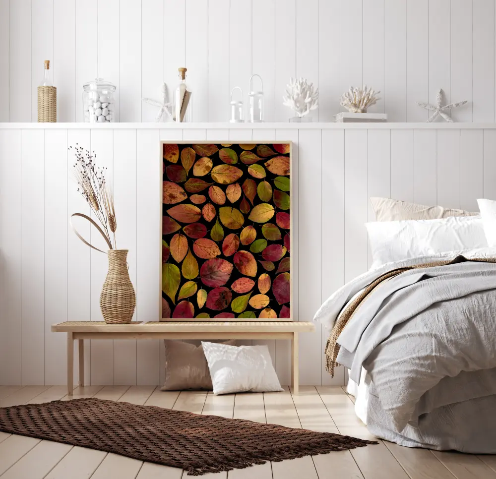 Une affiche à motifs de feuilles d'automne. Un éventail de couleurs jaunes, roses et rouges accueille l'œil dans cette collection organisée de feuilles. Les feuilles s'harmonisent toutes sur un fond sombre, ce qui donne à cette affiche toute la vivacité de l'automne. Parfait pour une touche de couleur dans votre cuisine ou dans un couloir.