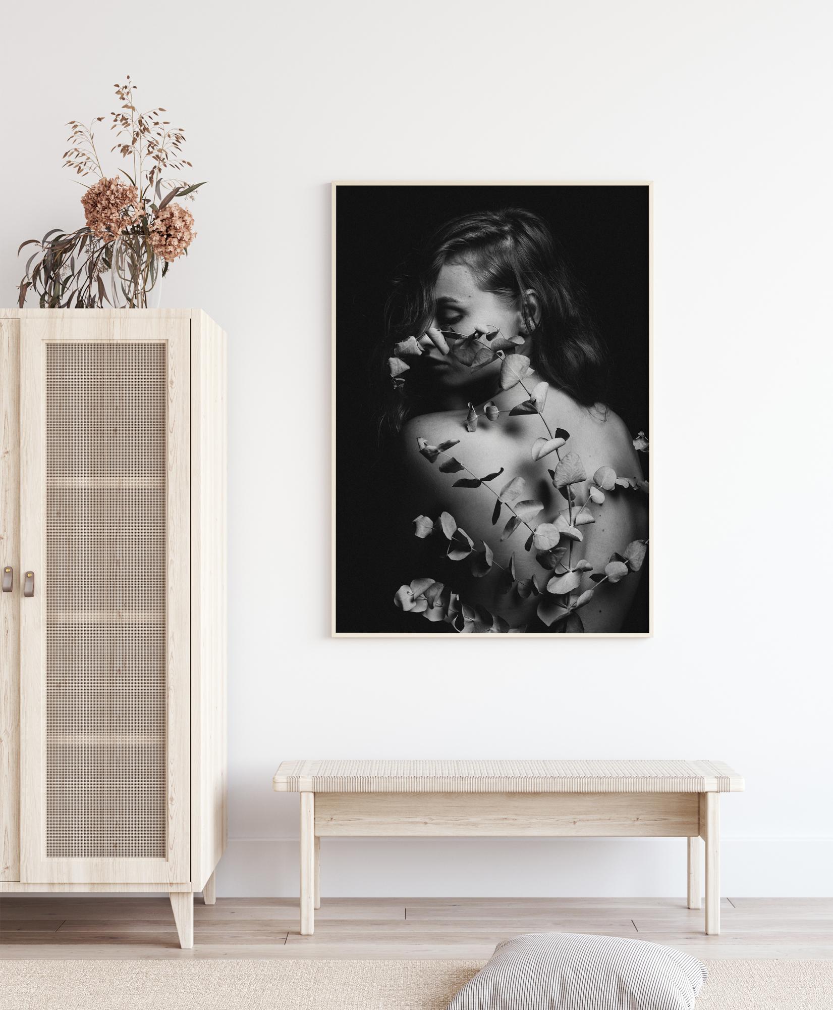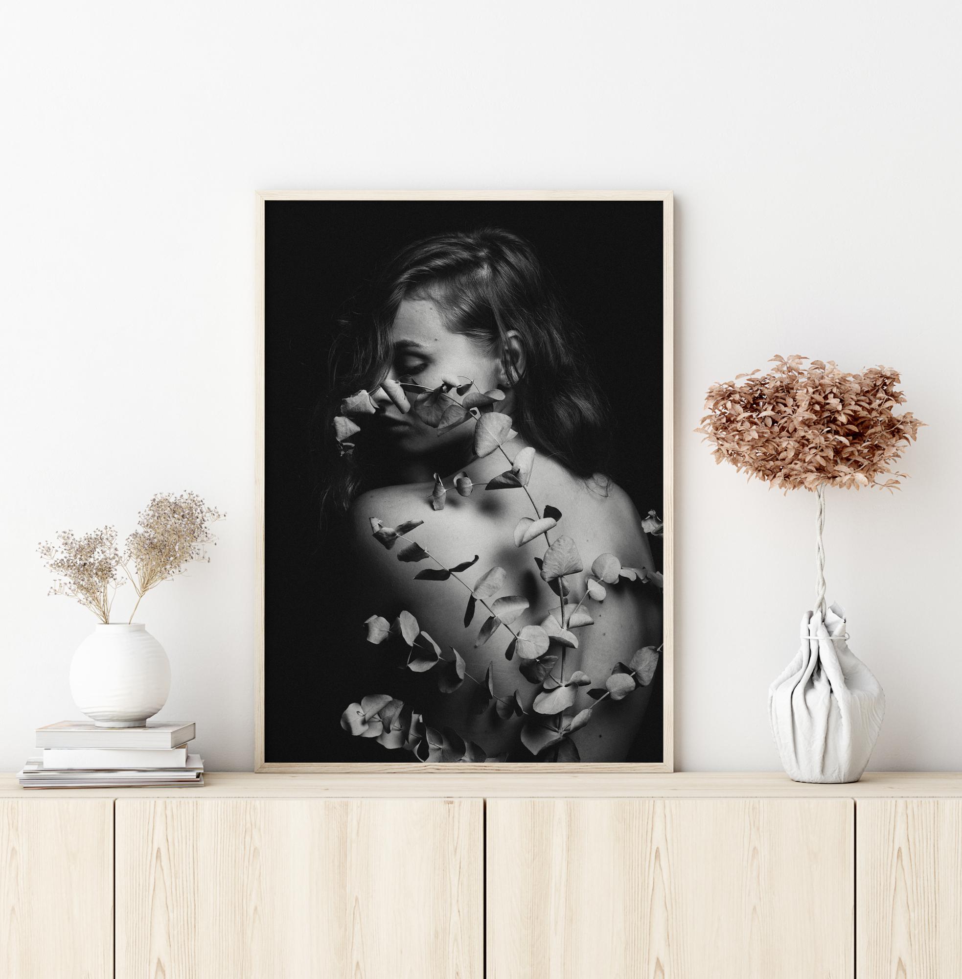 Une magnifique affiche d'une femme avec des feuilles dans le dos. Affichez ce poster en noir et blanc sur un mur de couleur vive pour un effet spectaculaire. Laissez le mystère et la paix s’installer chez vous.