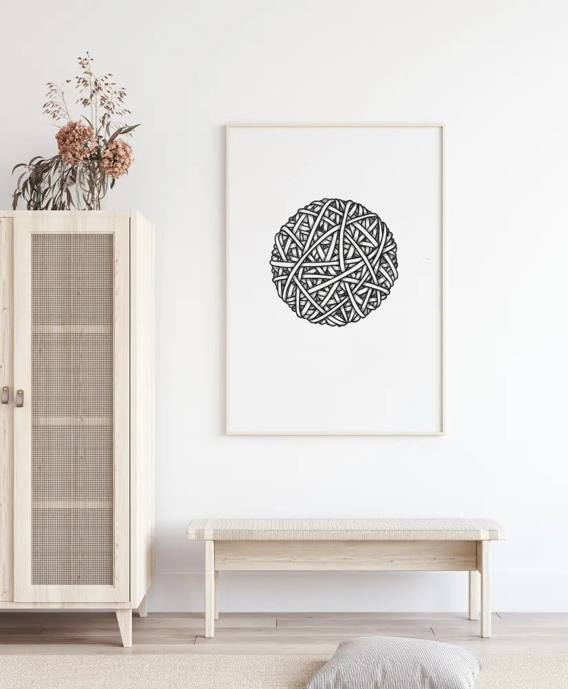 Un poster graphique en noir et blanc représentant une pelote de laine sous forme de balle. Une image simple et minimaliste qui se marie parfaitement avec d'autres favoris merveilleux dans un grand collage.