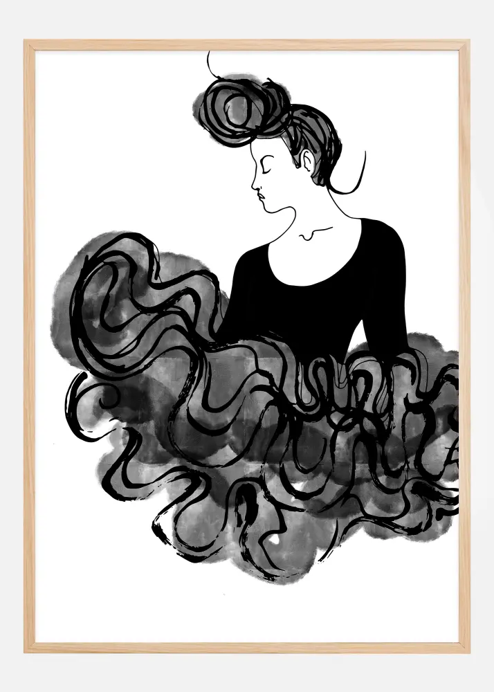 Introduisez une sensation de mouvement et de fluidité artistique dans votre maison avec notre affiche de ballerine abstraite. Cette élégante illustration en noir et blanc met en avant une silhouette féminine, capture un moment suspendu avec ses cheveux relevés en un chignon décontracté et une série de formes abstraites et flottantes qui composent sa jupe. Ces formes fluides, réalisées dans une subtile échelle de gris, créent une illusion de mouvement et de légèreté de la danse, comme si elles étaient des coups de pinceau d'encre balayés par un vent involontaire sur la toile.