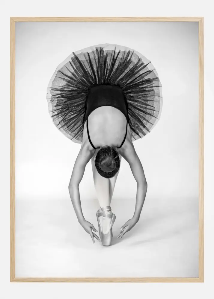 Portrait d'une ballerine. Cette danseuse de ballet se penche en avant en cinquième position, créant deux cercles parfaits avec ses bras et un tutu noir. L’affiche en noir et blanc la met en valeur, créant un look élégant et classique qui rehaussera un simple mur neutre, n'importe où dans votre maison.