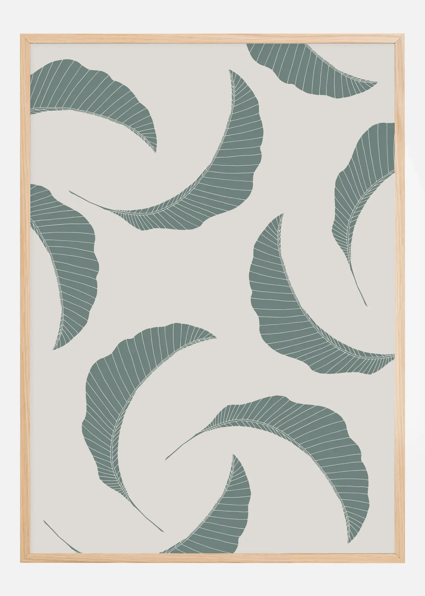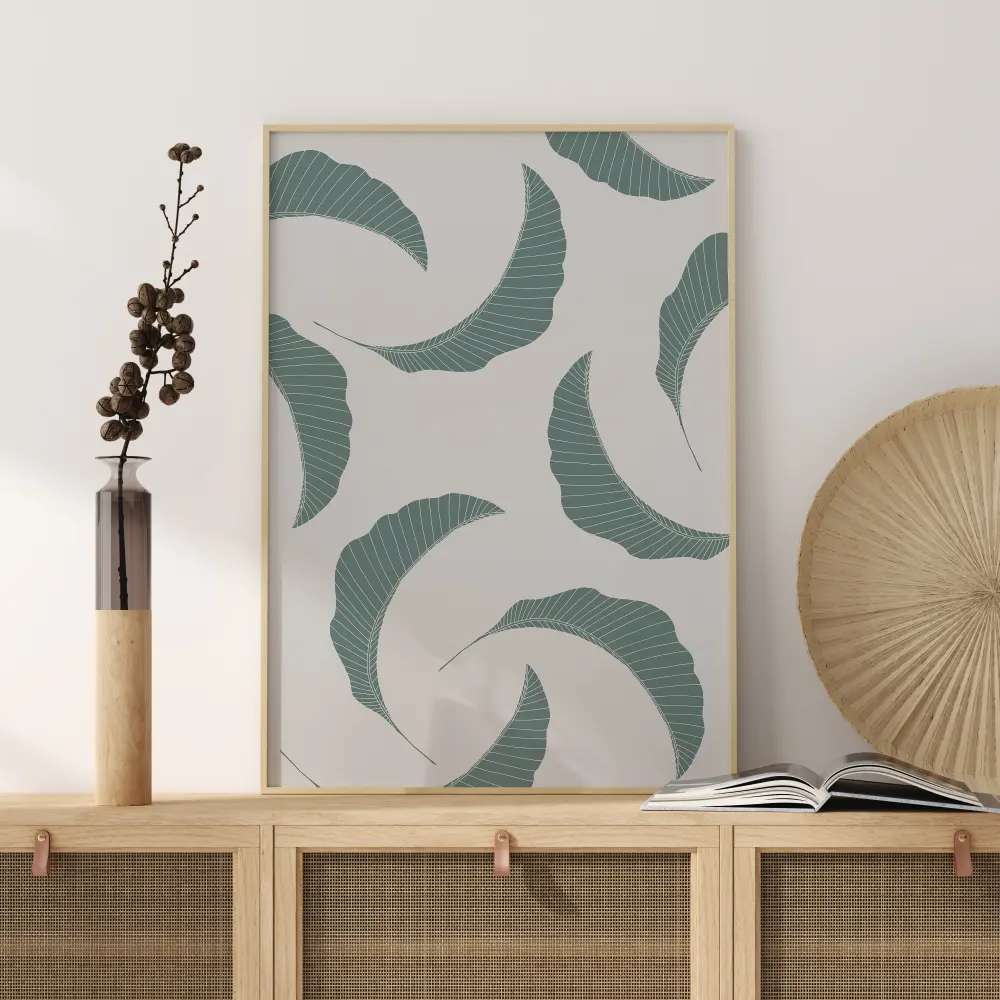 Une superbe affiche abstraite de feuilles de bananier bleues. Les feuilles bleues se détachent sur le fond blanc et dérivent doucement vers le bas, conduisant l'œil à travers cette pièce. Ajoutez cette affiche abstraite à un mur de couleur unie pour obtenir un effet remarquable, mais apaisant, dans votre maison.