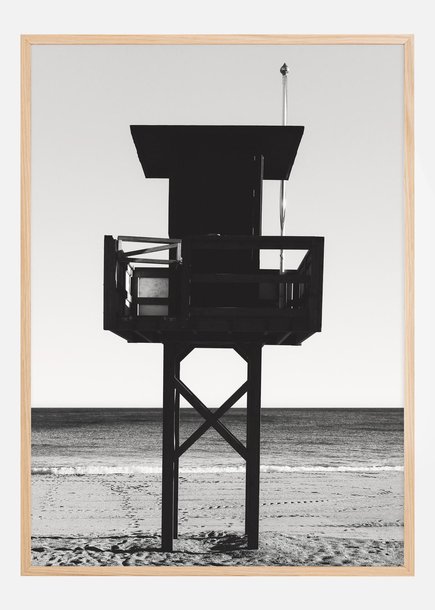 Ce poster monochrome présente une silhouette emblématique d'une tour de surveillance de plage contre un ciel clair et une mer calme. Le fort contraste entre la tour de surveillance sombre et les tons clairs du sable et du ciel confère à l'image une qualité graphique qui est à la fois frappante et contemporaine. L'image, prise à hauteur des yeux, crée un sentiment de présence et de calme, comme si l'on se tenait directement sur la plage en regardant l'océan vaste.