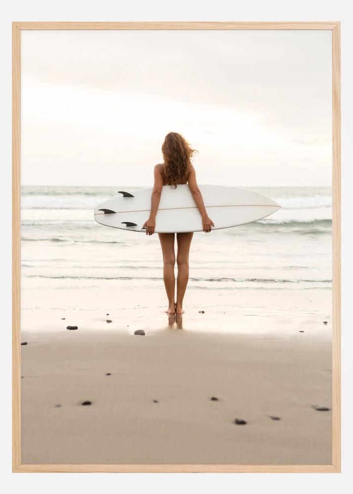Une magnifique photographie d'une femme sur la plage, tenant une planche de surf derrière son dos, scrutant l'horizon. Un vrai poster feel good avec des tons et des formes douces. Convient à la plupart des maisons et styles de décoration.