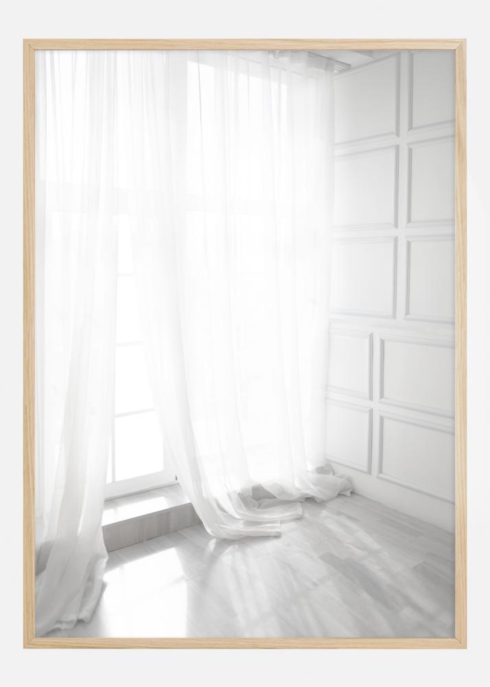 Ce poster paisible et pur montre un coin tranquille d'une pièce drapée de rideaux blancs translucides. La lumière filtrant à travers le tissu crée un jeu d'ombres et de nuances sur le sol brillant, donnant une sensation de paix et de clarté. Cette impression minimaliste est une expression de tranquillité et s'intégrerait parfaitement dans un environnement cherchant simplicité et calme.