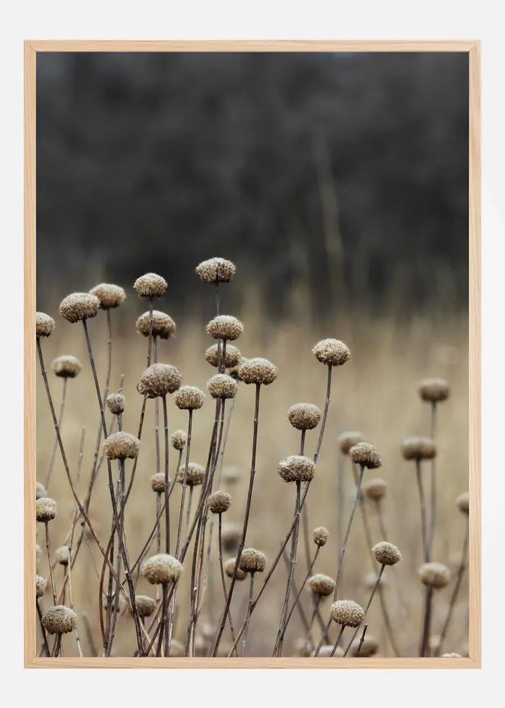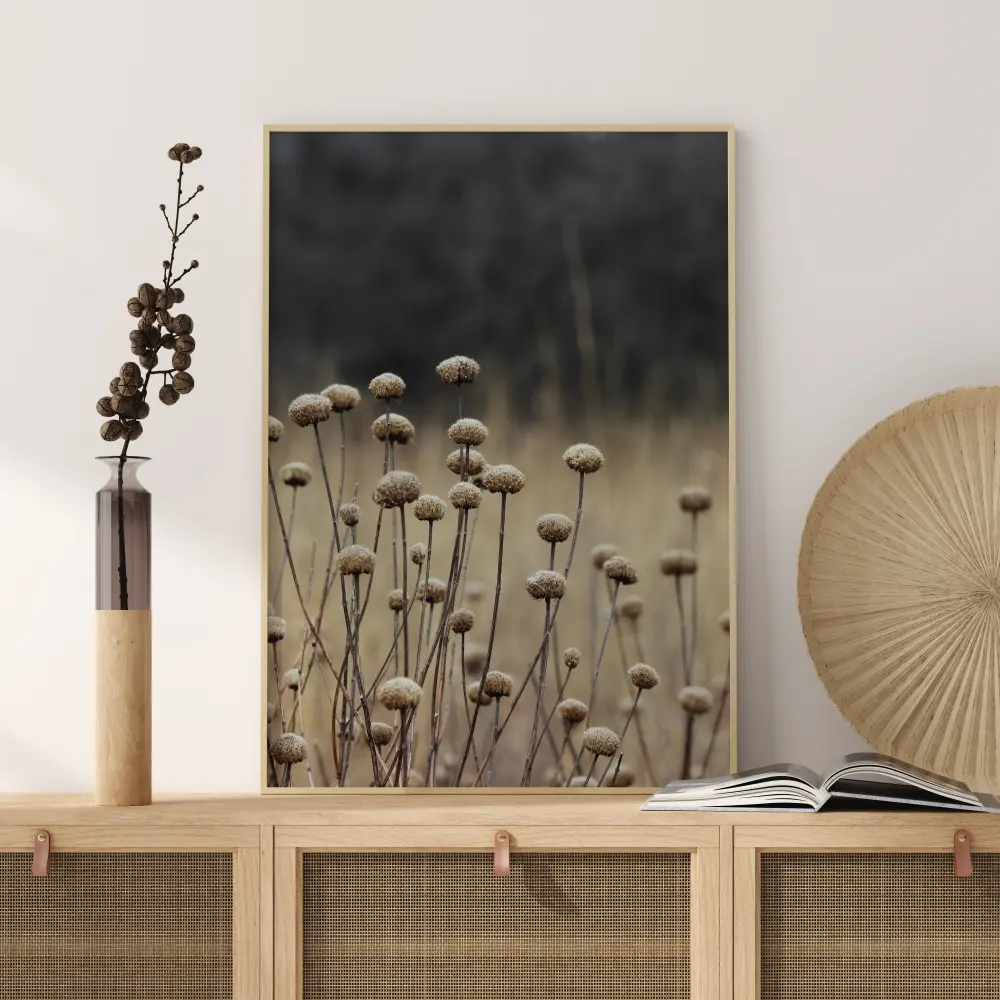 Une affiche, toute en simplicité d'un champ avec des têtes de fleurs sauvages. Les tiges de fleurs sauvages sont au premier plan, le reste du champ s'efface au loin, ce qui permet de garder le regard sur ces têtes de fleurs. Associez les couleurs beige et crème de ce poster à un mur bleu tendre pour un look contrasté.