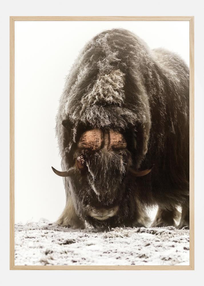 Poster animalier d'un yak recouvert de neige. La longue fourrure brune du yak semble douce et luxuriante alors qu'il fait face à l'appareil photo à la recherche de nourriture. L'arrière-plan, blanc comme neige, le fait ressortir et ajoute une touche dramatique à l'image. Affichez cette affiche sur votre mur pour donner un côté hivernal.