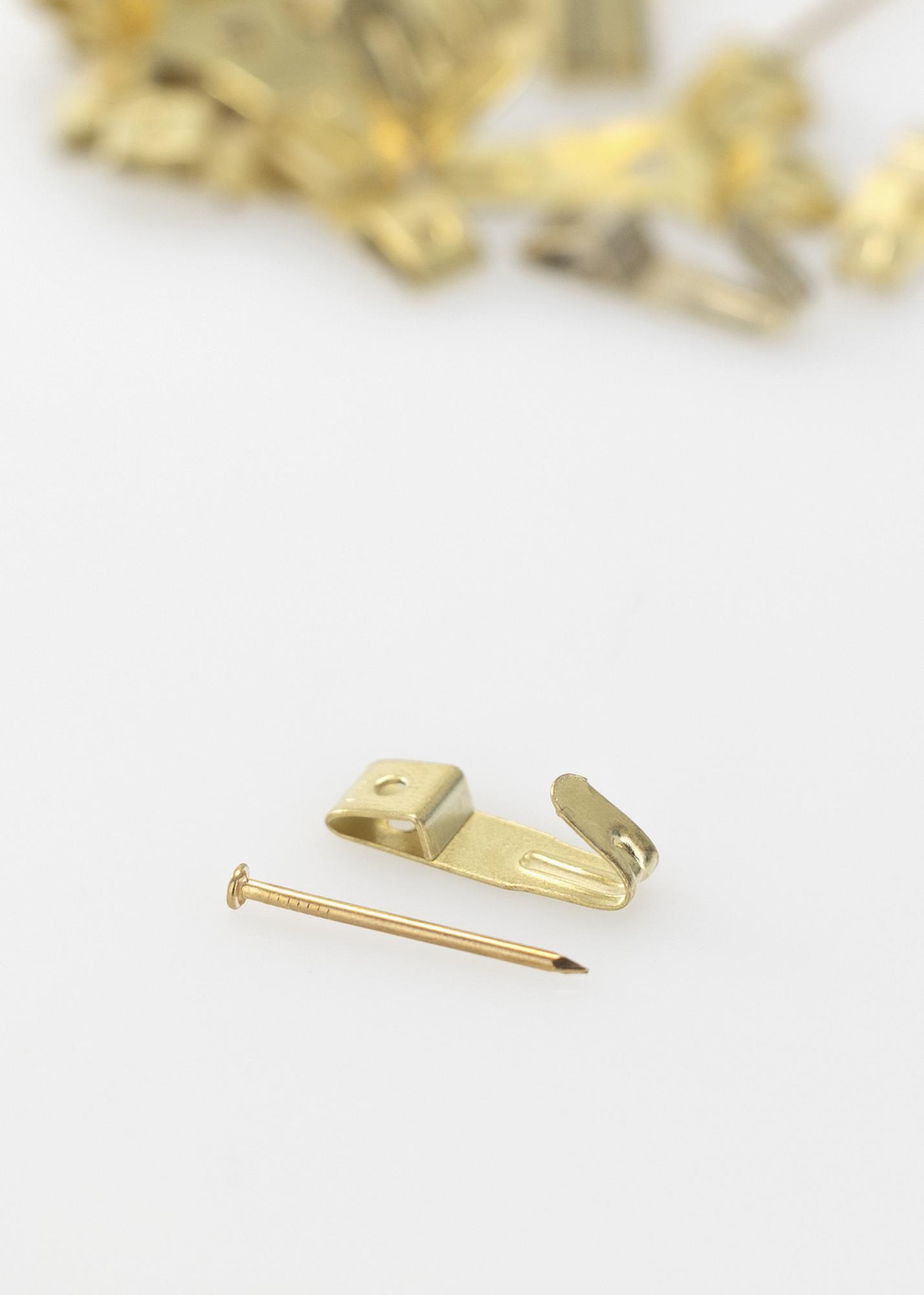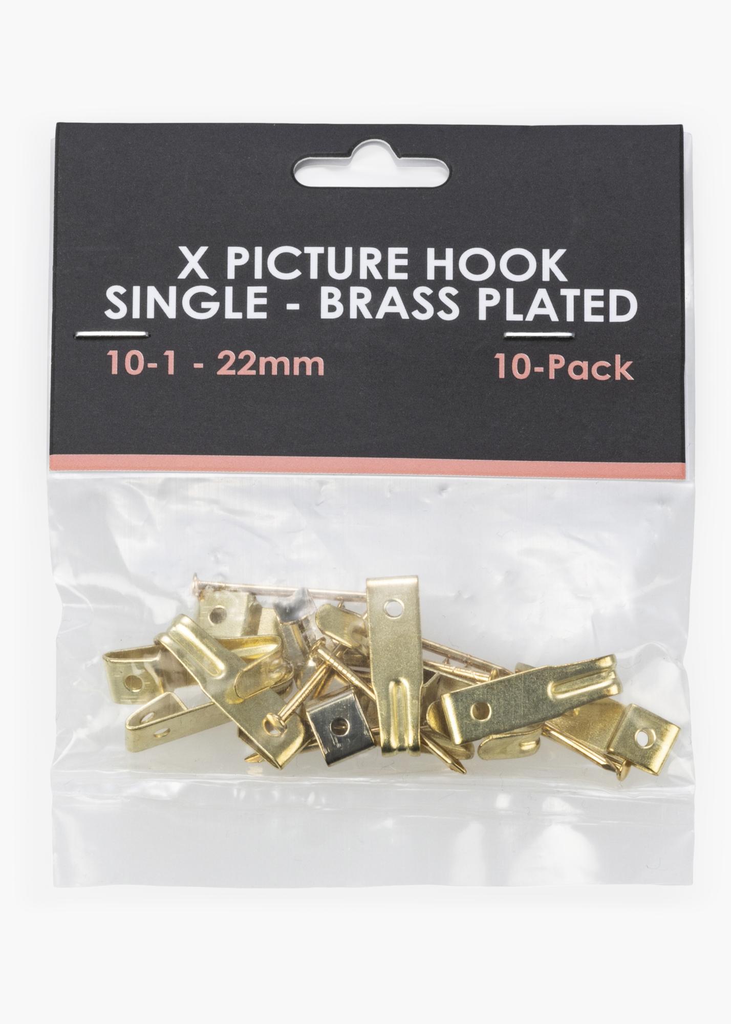 Crochet en X pour accrochage sur un mur en bois ou en plâtre. Peut supporter des charges jusqu'à 5 kg. Couleur laiton.