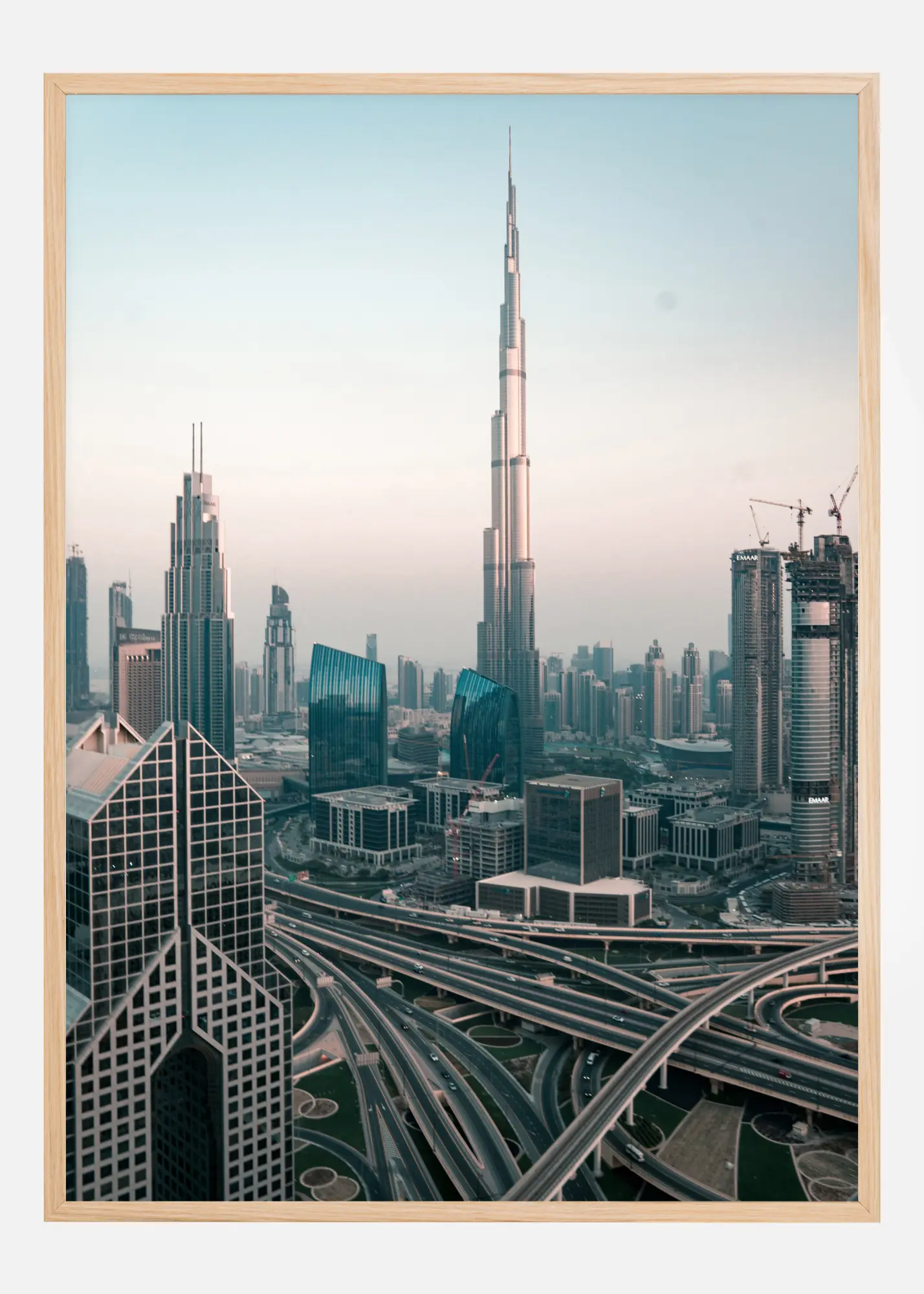 Une affiche de paysage urbain avec des routes qui se croisent et un grand gratte-ciel au centre. Cette affiche très animée met en évidence l'effervescence de la vie urbaine. Les routes très fréquentées se croisent pour former des formes intéressantes qui conduisent le regard vers la grande tour pointue qui s'élève dans le ciel bleu brumeux et doux.