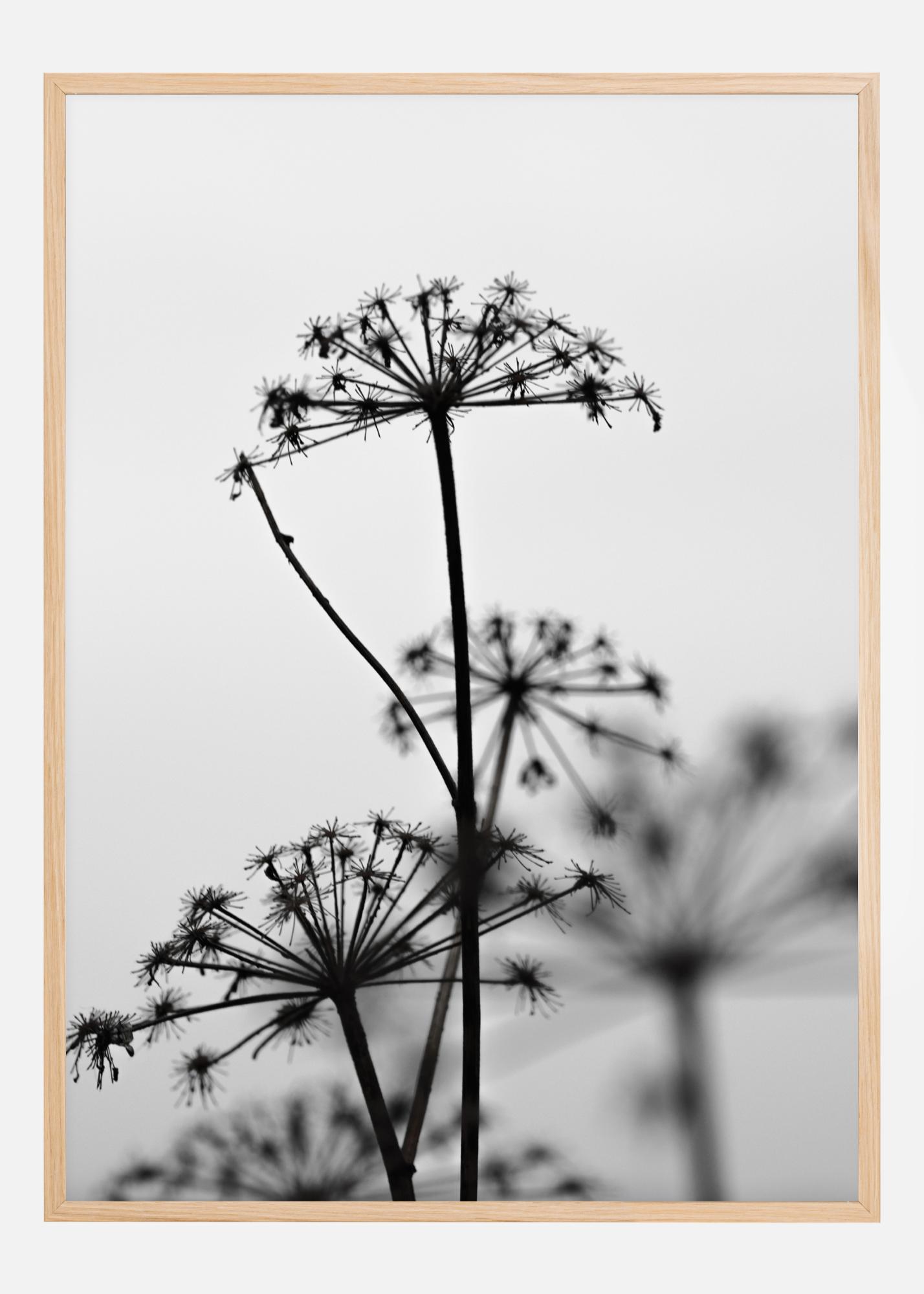 Un simple poster de têtes d'ombellifères sur un fond blanc. Les silhouettes noires des tiges et des têtes de graines de ces ombellifères contrastent avec le simple fond blanc. Ajoutez cette pièce fascinante à un mur coloré pour vous émerveiller des détails de ces têtes de fleurs.
