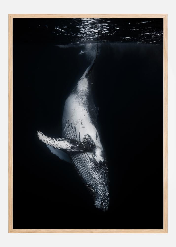 Dans ce poster illustré, une baleine à bosse glisse gracieusement à travers les eaux sombres, une image qui capture l'essence de la vie marine. La composition contrastée en noir et blanc met en valeur la peau texturée de la baleine et les contours élégants de son corps, créant une image puissante de tranquillité et de grâce sous la surface.