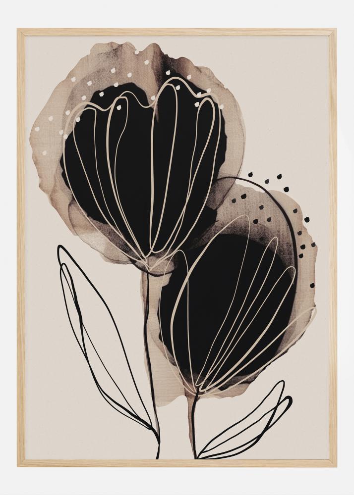 La palette de couleurs est restreinte mais puissante, avec des détails en noir et blanc qui mettent en valeur les lignes graphiques des formes florales sur un fond de couleur terre. Cette impression est parfaite pour ajouter une touche contemporaine à n'importe quelle pièce, et est particulièrement frappante dans des environnements minimalistes ou modernes où sa belle sobriété peut être le centre d'attention.