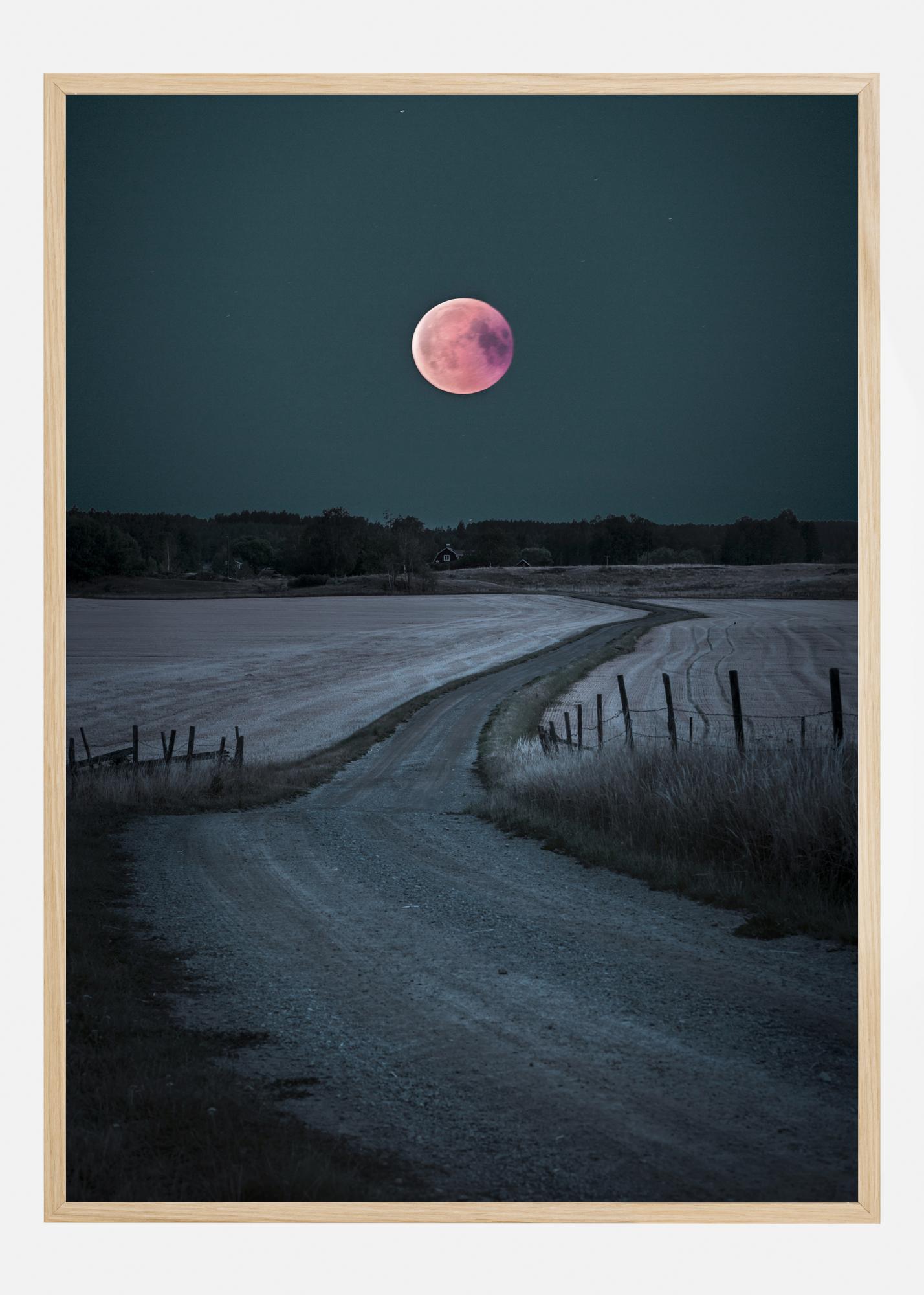 Une affiche étonnante d'un paysage enneigé avec une lune de sang rouge vif au centre. Une route s'éloigne, attirant le regard sur la lune qui pend au ras du ciel. Les gris et les bleus se détachent sur le rouge et le rose de la lune pour créer un sentiment d'émerveillement dans cette photo de nuit.