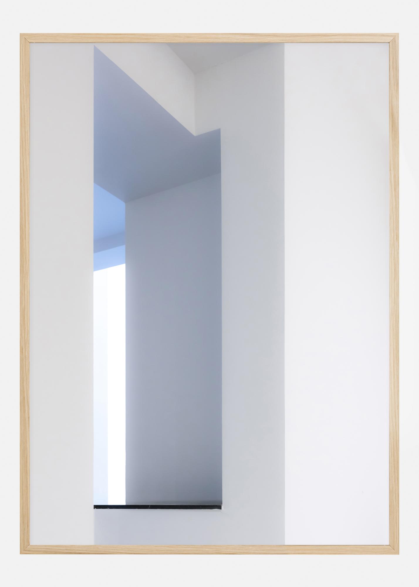 Une affiche représente des murs et une fenêtre. Les murs blancs et gris et les formes géométriques conduisent le regard vers la fenêtre et le mur blanc lumineux et le ciel bleu qui se trouve au-delà. Accrochez ce poster dans une pièce plus sombre pour apporter la sensation et l'illusion de lumière et d'espace.Égayez-le !