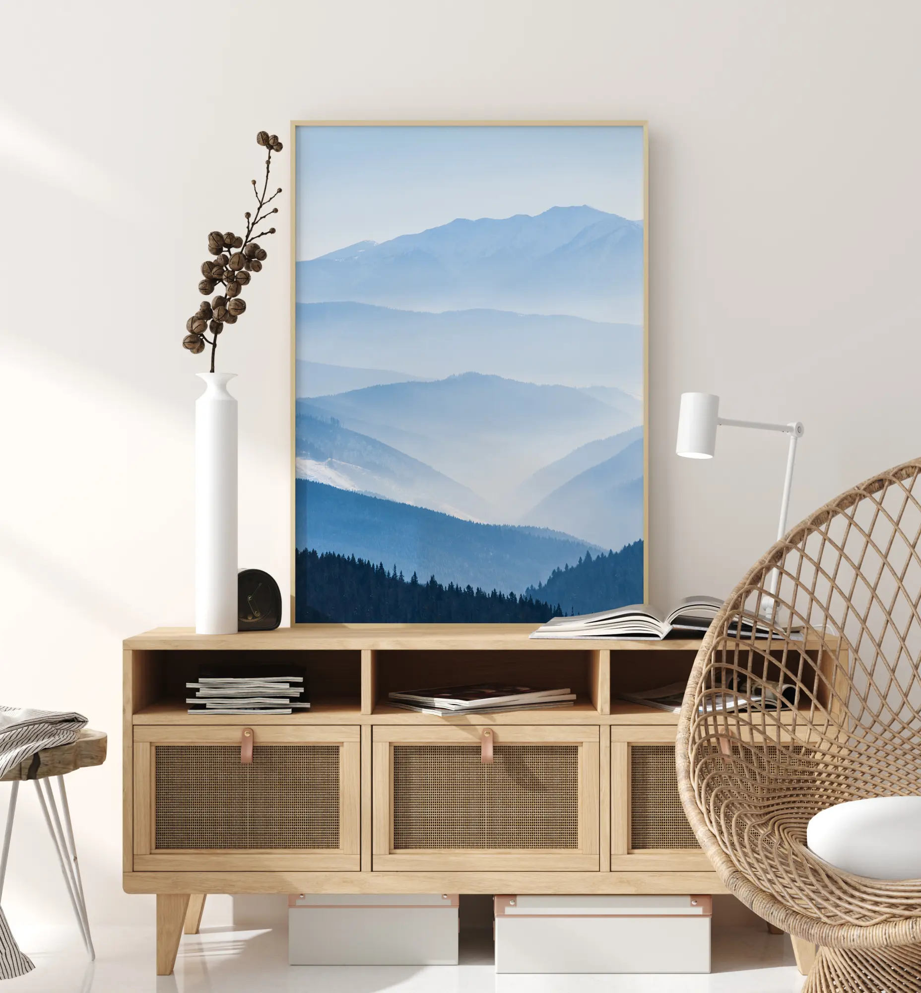 Une simple affiche représentant des sommets de montagnes en déclin. Deux sommets de montagne couverts de forêts se trouvent au premier plan. À mesure que les montagnes disparaissent au loin, les bleus s'estompent pour laisser place à de doux blancs. Ajoutez ce poster à votre chambre pour apporter de la tranquillité à votre maison grâce à ces tons bleus apaisants.