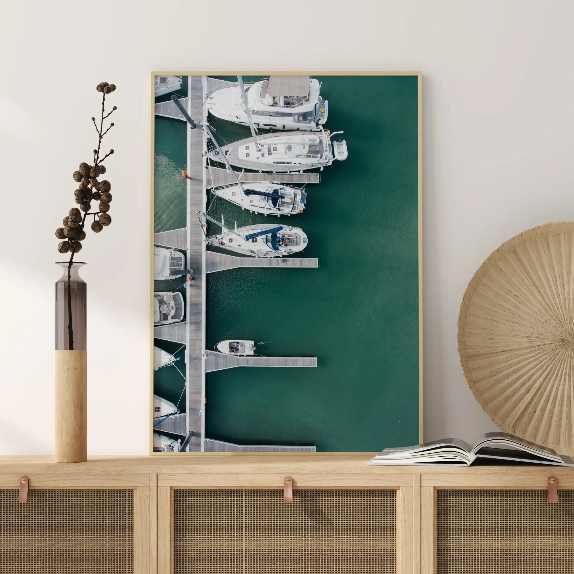 Affiche d'une vue à vol d'oiseau d'une marina avec une série de bateaux. Les eaux vertes clapotent contre la passerelle de la marina où différents bateaux sont amarrés. Mais toutes les baies ne sont pas remplies, ce qui laisse des espaces vides. Appréciez la simplicité de cette image aérienne de chez vous.